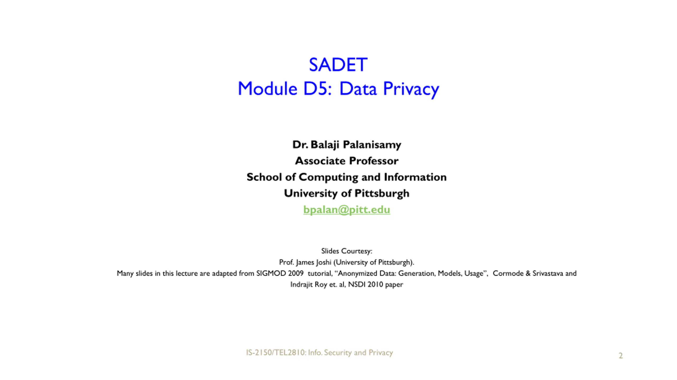 SADET Module D5: Data Privacy Dr. Balaji Palanisamy Associate Professor School of Computing and Information University of Pittsburgh bpalan@pitt.edu Slides Courtesy: Prof. James Joshi (University of Pittsburgh). Many slides in this lecture are adapted from SIGMOD 2009 tutorial, Anonymized Data: Generation, Models, Usage , Cormode & Srivastava and Indrajit Roy et. al, NSDI 2010 paper IS-2150/TEL2810: Info. Security and Privacy 2
