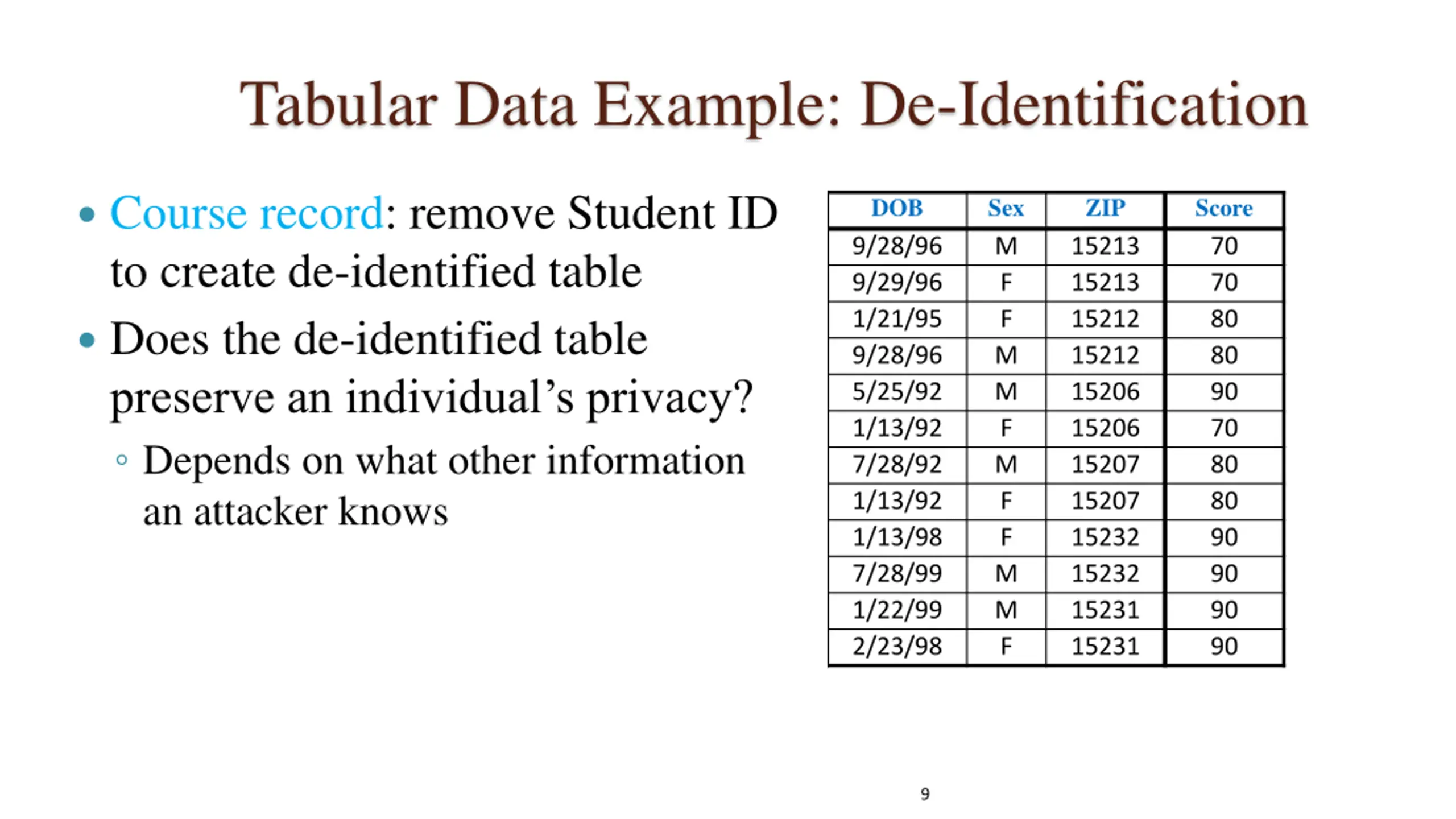 Tabular Data Example: De-Identification Course record: remove Student ID to create de-identified table Does the de-identified table preserve an individual s privacy? Depends on what other information an attacker knows DOB 9/28/96 9/29/96 1/21/95 9/28/96 5/25/92 1/13/92 7/28/92 1/13/92 1/13/98 7/28/99 1/22/99 2/23/98 Sex M F F M M F M F F M M F ZIP 15213 15213 15212 15212 15206 15206 15207 15207 15232 15232 15231 15231 Score 70 70 80 80 90 70 80 80 90 90 90 90 9