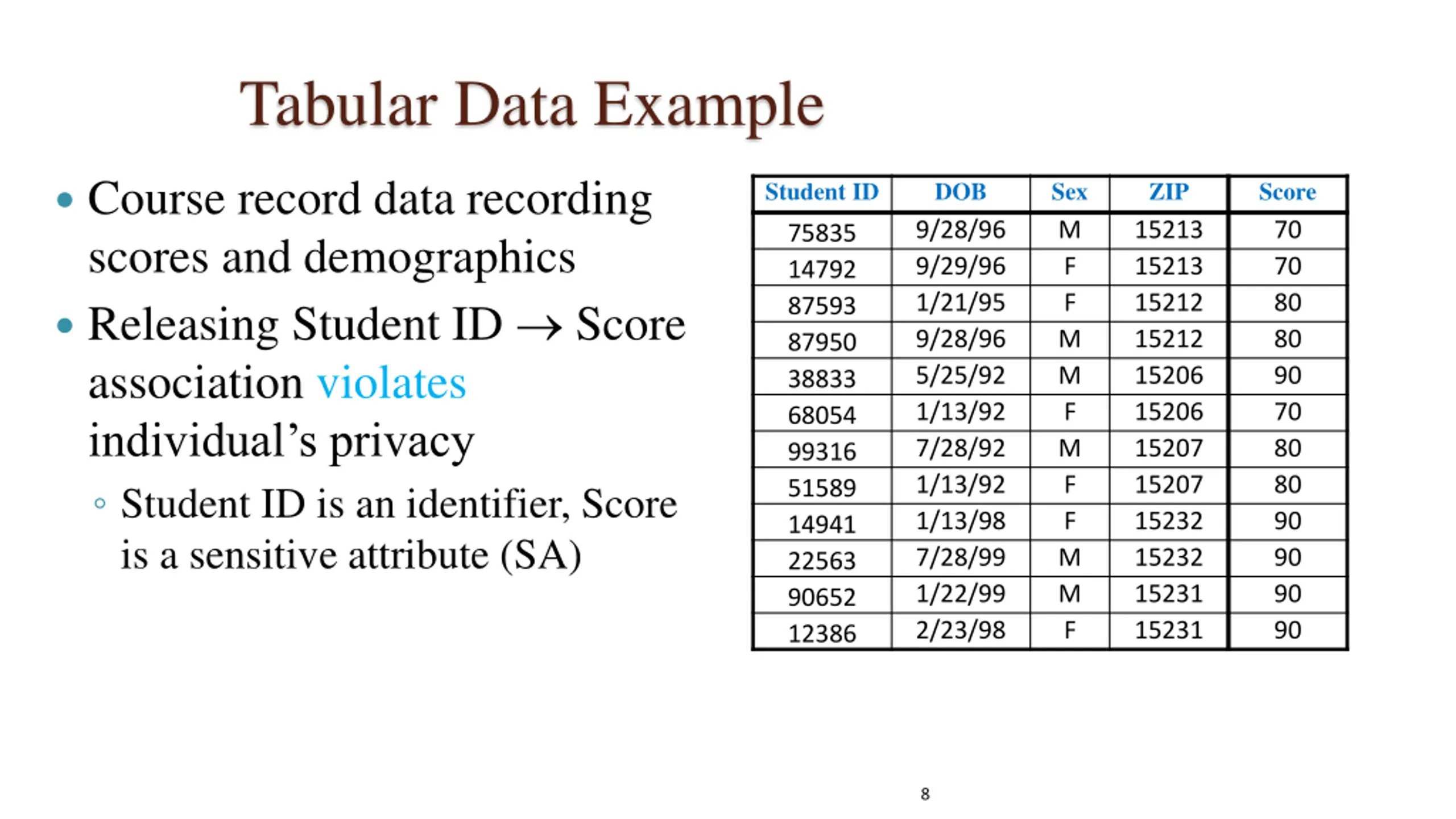 Tabular Data Example Course record data recording scores and demographics Releasing Student ID Score association violates individual s privacy Student ID is an identifier, Score is a sensitive attribute (SA) Student ID DOB 9/28/96 9/29/96 1/21/95 9/28/96 5/25/92 1/13/92 7/28/92 1/13/92 1/13/98 7/28/99 1/22/99 2/23/98 Sex M F F M M F M F F M M F ZIP 15213 15213 15212 15212 15206 15206 15207 15207 15232 15232 15231 15231 Score 70 70 80 80 90 70 80 80 90 90 90 90 75835 14792 87593 87950 38833 68054 99316 51589 14941 22563 90652 12386 8
