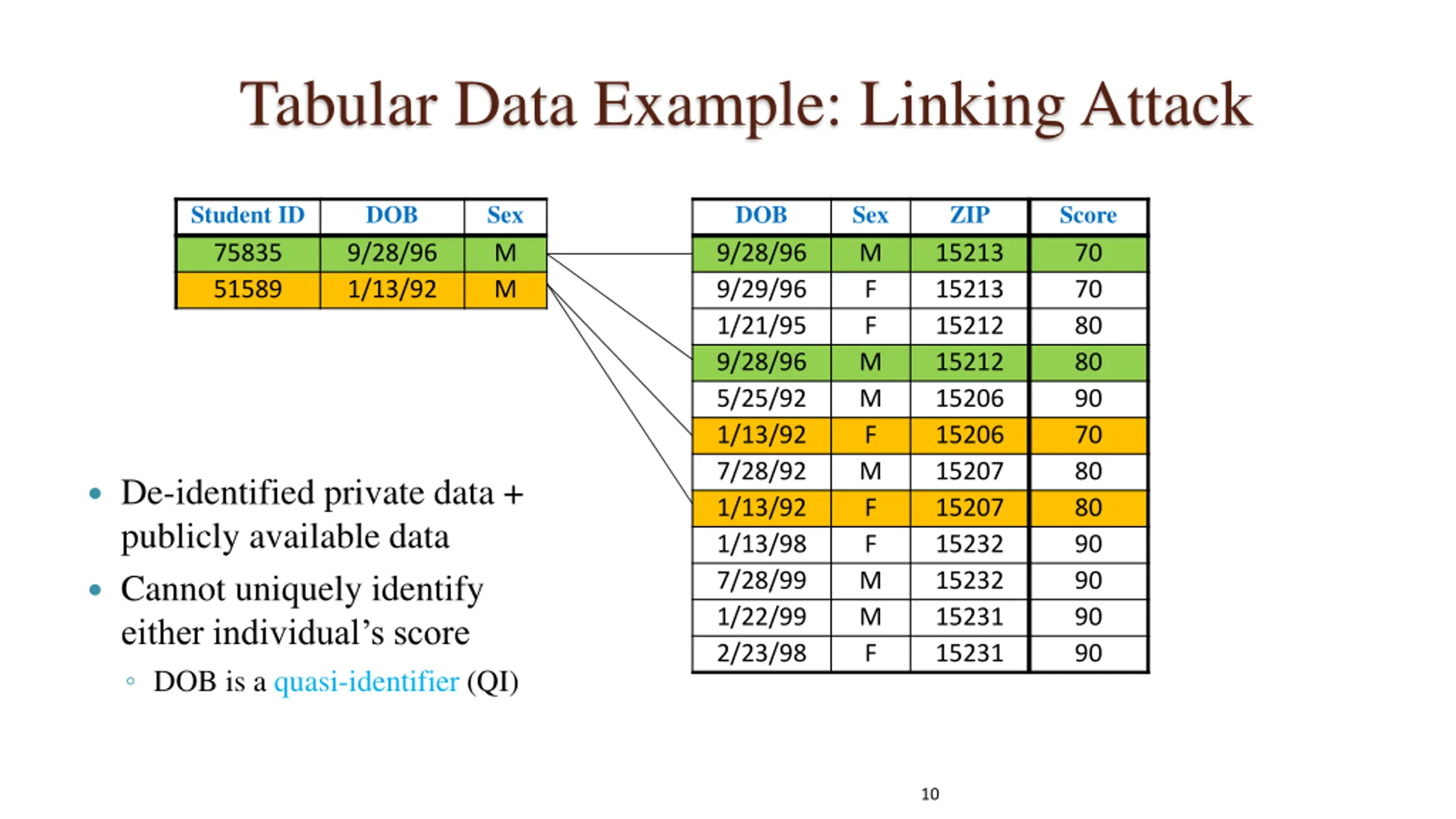 Tabular Data Example: Linking Attack Student ID 75835 51589 DOB 9/28/96 1/13/92 Sex M M DOB 9/28/96 9/29/96 1/21/95 9/28/96 5/25/92 1/13/92 7/28/92 1/13/92 1/13/98 7/28/99 1/22/99 2/23/98 Sex M F F M M F M F F M M F ZIP 15213 15213 15212 15212 15206 15206 15207 15207 15232 15232 15231 15231 Score 70 70 80 80 90 70 80 80 90 90 90 90 De-identified private data + publicly available data Cannot uniquely identify either individual s score DOB is a quasi-identifier (QI) 10