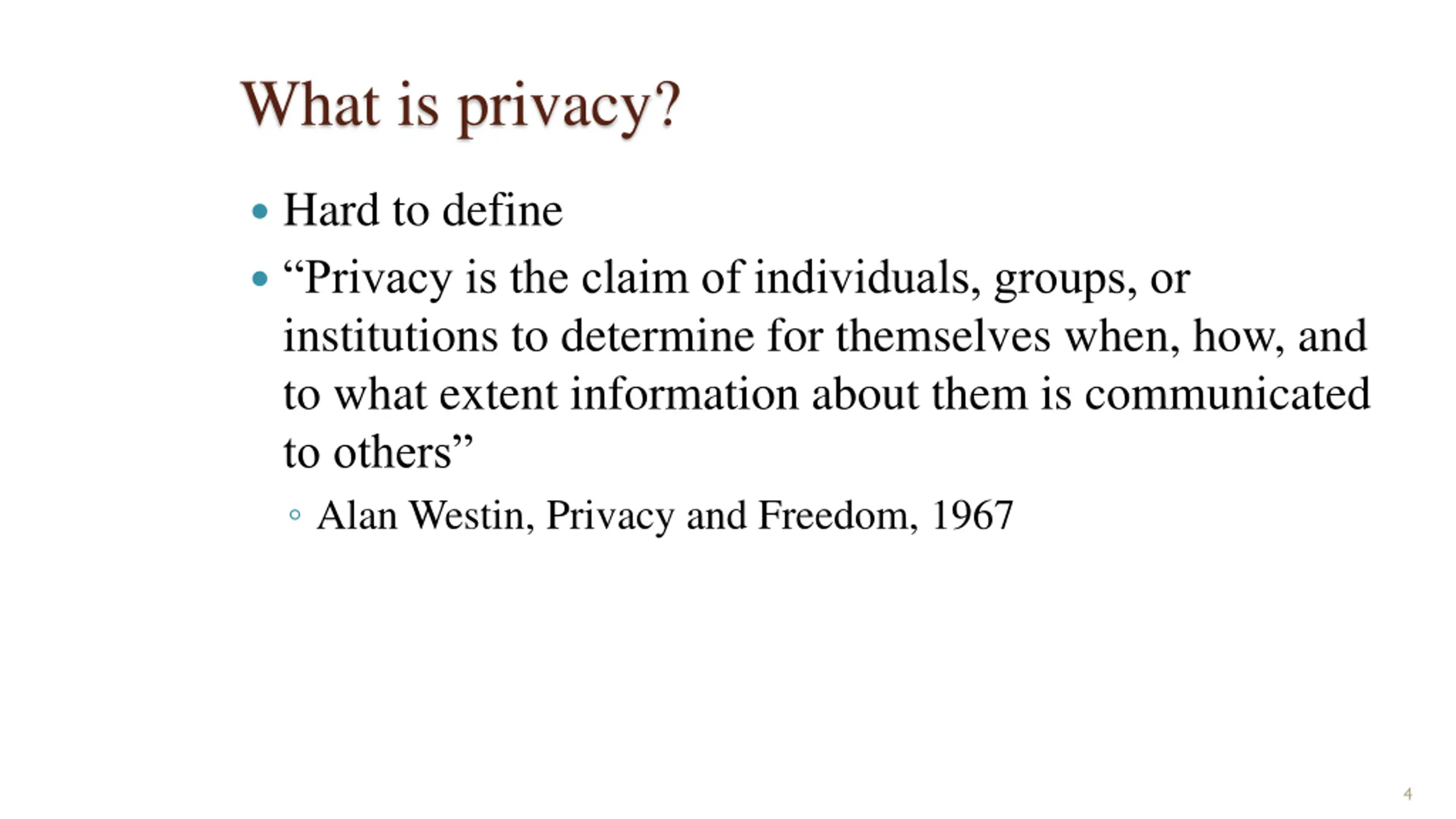 What is privacy? Hard to define Privacy is the claim of individuals, groups, or institutions to determine for themselves when, how, and to what extent information about them is communicated to others Alan Westin, Privacy and Freedom, 1967 4