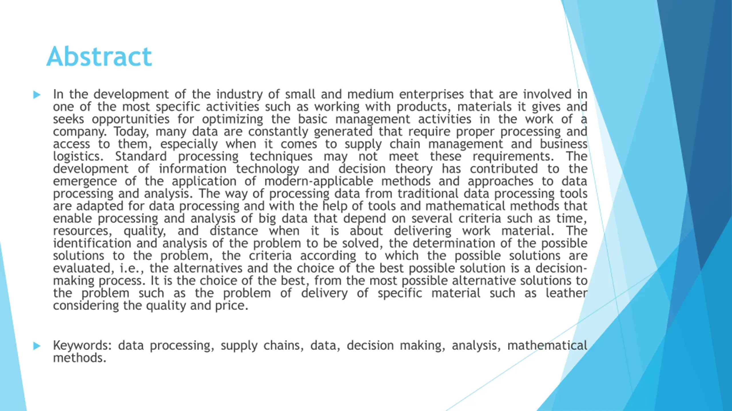 Abstract In the development of the industry of small and medium enterprises that are involved in one of the most specific activities such as working with products, materials it gives and seeks opportunities for optimizing the basic management activities in the work of a company. Today, many data are constantly generated that require proper processing and access to them, especially when it comes to supply chain management and business logistics. Standard processing techniques may not meet these requirements. The development of information technology and decision theory has contributed to the emergence of the application of modern-applicable methods and approaches to data processing and analysis. The way of processing data from traditional data processing tools are adapted for data processing and with the help of tools and mathematical methods that enable processing and analysis of big data that depend on several criteria such as time, resources, quality, and distance when it is about delivering work material. The identification and analysis of the problem to be solved, the determination of the possible solutions to the problem, the criteria according to which the possible solutions are evaluated, i.e., the alternatives and the choice of the best possible solution is a decision- making process. It is the choice of the best, from the most possible alternative solutions to the problem such as the problem of delivery of specific material such as leather considering the quality and price. Keywords: data processing, supply chains, data, decision making, analysis, mathematical methods.