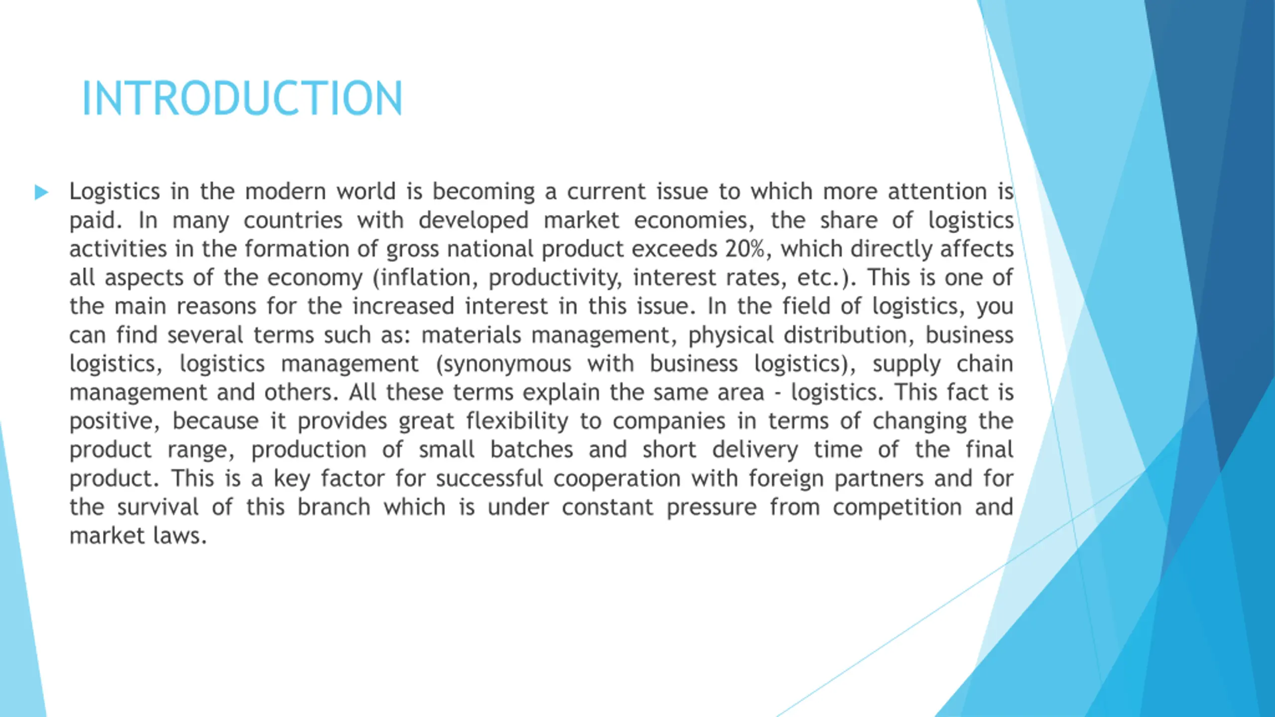 INTRODUCTION Logistics in the modern world is becoming a current issue to which more attention is paid. In many countries with developed market economies, the share of logistics activities in the formation of gross national product exceeds 20%, which directly affects all aspects of the economy (inflation, productivity, interest rates, etc.). This is one of the main reasons for the increased interest in this issue. In the field of logistics, you can find several terms such as: materials management, physical distribution, business logistics, logistics management (synonymous with business logistics), supply chain management and others. All these terms explain the same area - logistics. This fact is positive, because it provides great flexibility to companies in terms of changing the product range, production of small batches and short delivery time of the final product. This is a key factor for successful cooperation with foreign partners and for the survival of this branch which is under constant pressure from competition and market laws.