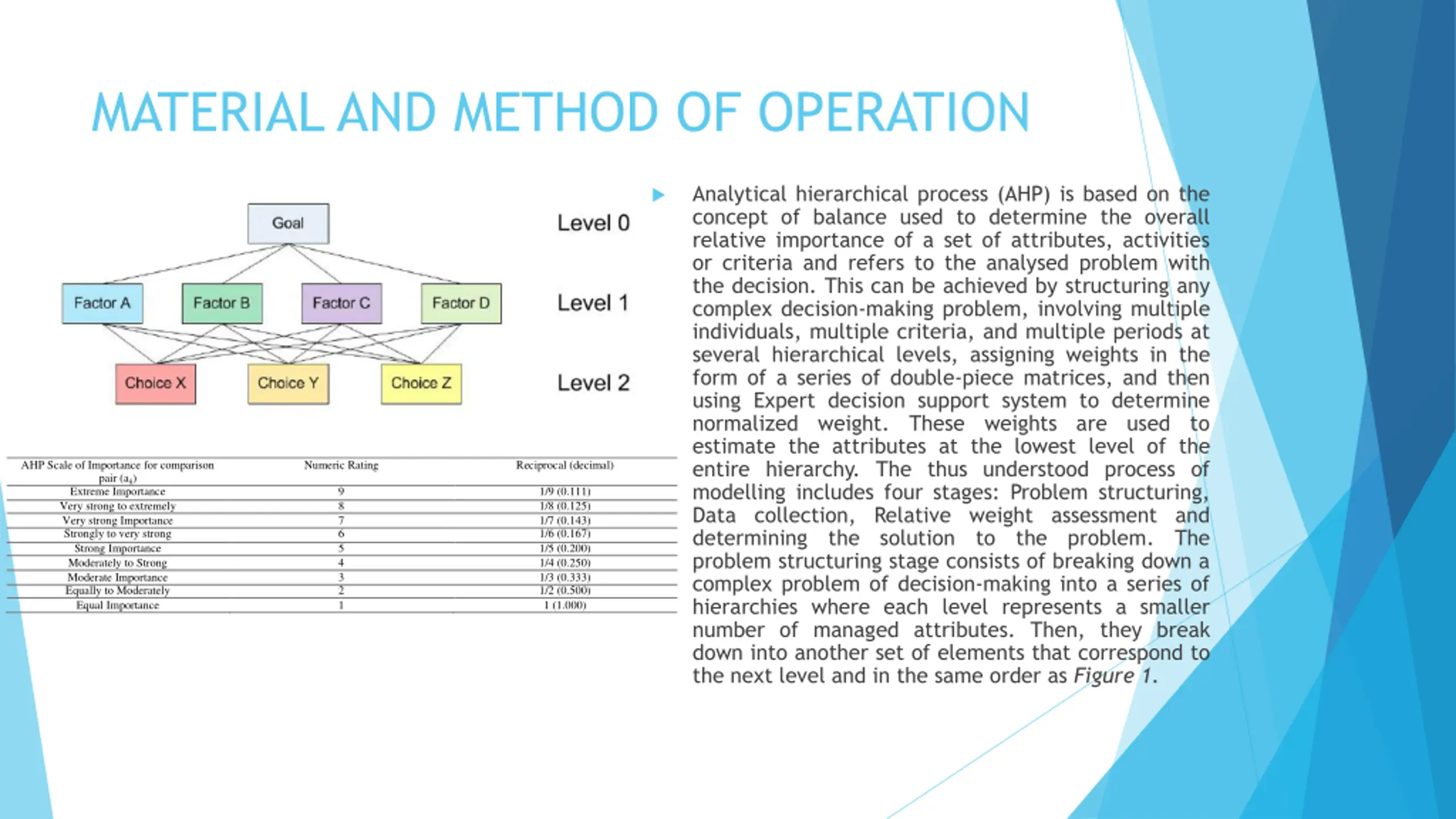 MATERIAL AND METHOD OF OPERATION Analytical hierarchical process (AHP) is based on the concept of balance used to determine the overall relative importance of a set of attributes, activities or criteria and refers to the analysed problem with the decision. This can be achieved by structuring any complex decision-making problem, involving multiple individuals, multiple criteria, and multiple periods at several hierarchical levels, assigning weights in the form of a series of double-piece matrices, and then using Expert decision support system to determine normalized weight. These estimate the attributes at the lowest level of the entire hierarchy. The thus understood process of modelling includes four stages: Problem structuring, Data collection, Relative weight assessment and determining the solution problem structuring stage consists of breaking down a complex problem of decision-making into a series of hierarchies where each level represents a smaller number of managed attributes. Then, they break down into another set of elements that correspond to the next level and in the same order as Figure 1. weights are used to AHP Scale of Importance for comparison pair (aij) Extreme Importance Very strong to extremely Very strong Importance Strongly to very strong Strong Importance Moderately to Strong Moderate Importance Equally to Moderately Equal Importance Numeric Rating Reciprocal (decimal) 9 8 7 6 5 4 3 2 1 1/9 (0.111) 1/8 (0.125) 1/7 (0.143) 1/6 (0.167) 1/5 (0.200) 1/4 (0.250) 1/3 (0.333) 1/2 (0.500) 1 (1.000) to the problem. The