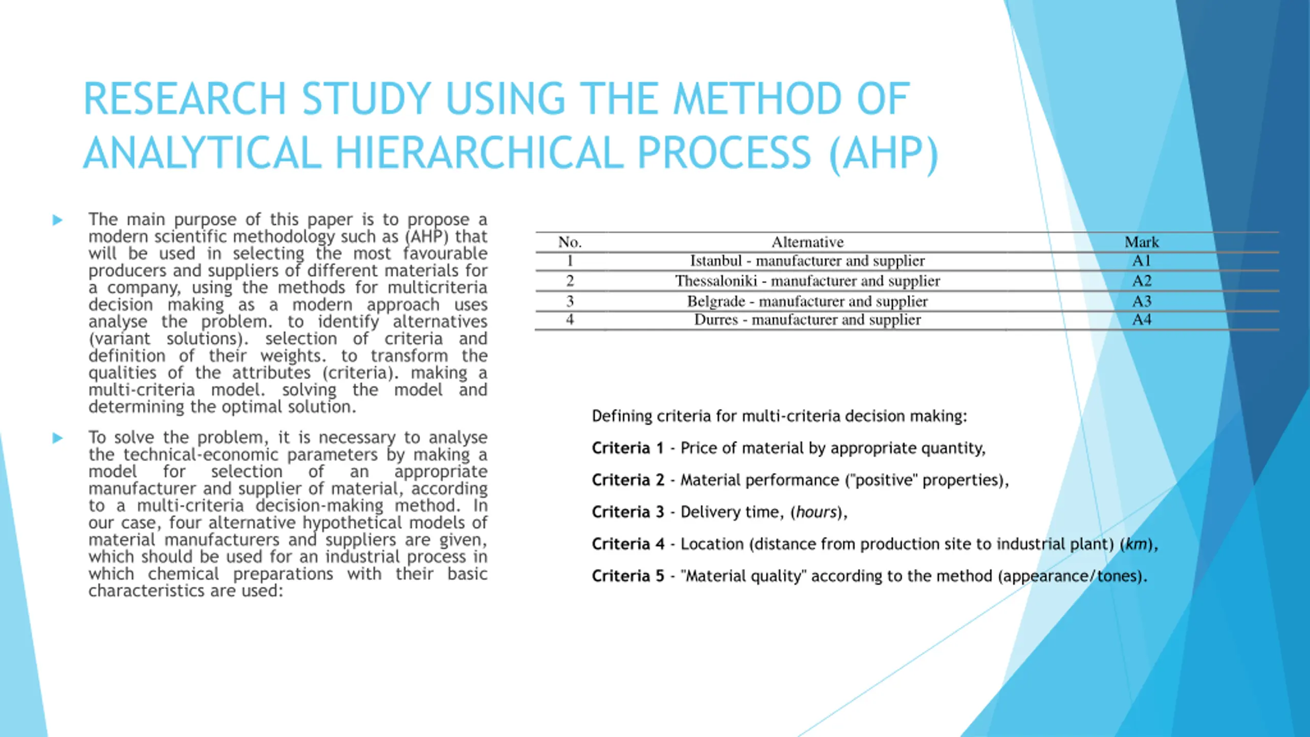 RESEARCH STUDY USING THE METHOD OF ANALYTICAL HIERARCHICAL PROCESS (AHP) The main purpose of this paper is to propose a modern scientific methodology such as (AHP) that will be used in selecting the most favourable producers and suppliers of different materials for a company, using the methods for multicriteria decision making as a modern approach uses analyse the problem. to identify alternatives (variant solutions). selection of criteria and definition of their weights. to transform the qualities of the attributes (criteria). making a multi-criteria model. solving the model and determining the optimal solution. No. 1 2 3 4 Alternative Mark A1 A2 A3 A4 Istanbul - manufacturer and supplier Thessaloniki - manufacturer and supplier Belgrade - manufacturer and supplier Durres - manufacturer and supplier Defining criteria for multi-criteria decision making: To solve the problem, it is necessary to analyse the technical-economic parameters by making a model for selection manufacturer and supplier of material, according to a multi-criteria decision-making method. In our case, four alternative hypothetical models of material manufacturers and suppliers are given, which should be used for an industrial process in which chemical preparations with their basic characteristics are used: Criteria 1 - Price of material by appropriate quantity, of an appropriate Criteria 2 - Material performance ("positive" properties), Criteria 3 - Delivery time, (hours), Criteria 4 - Location (distance from production site to industrial plant) (km), Criteria 5 - "Material quality" according to the method (appearance/tones).