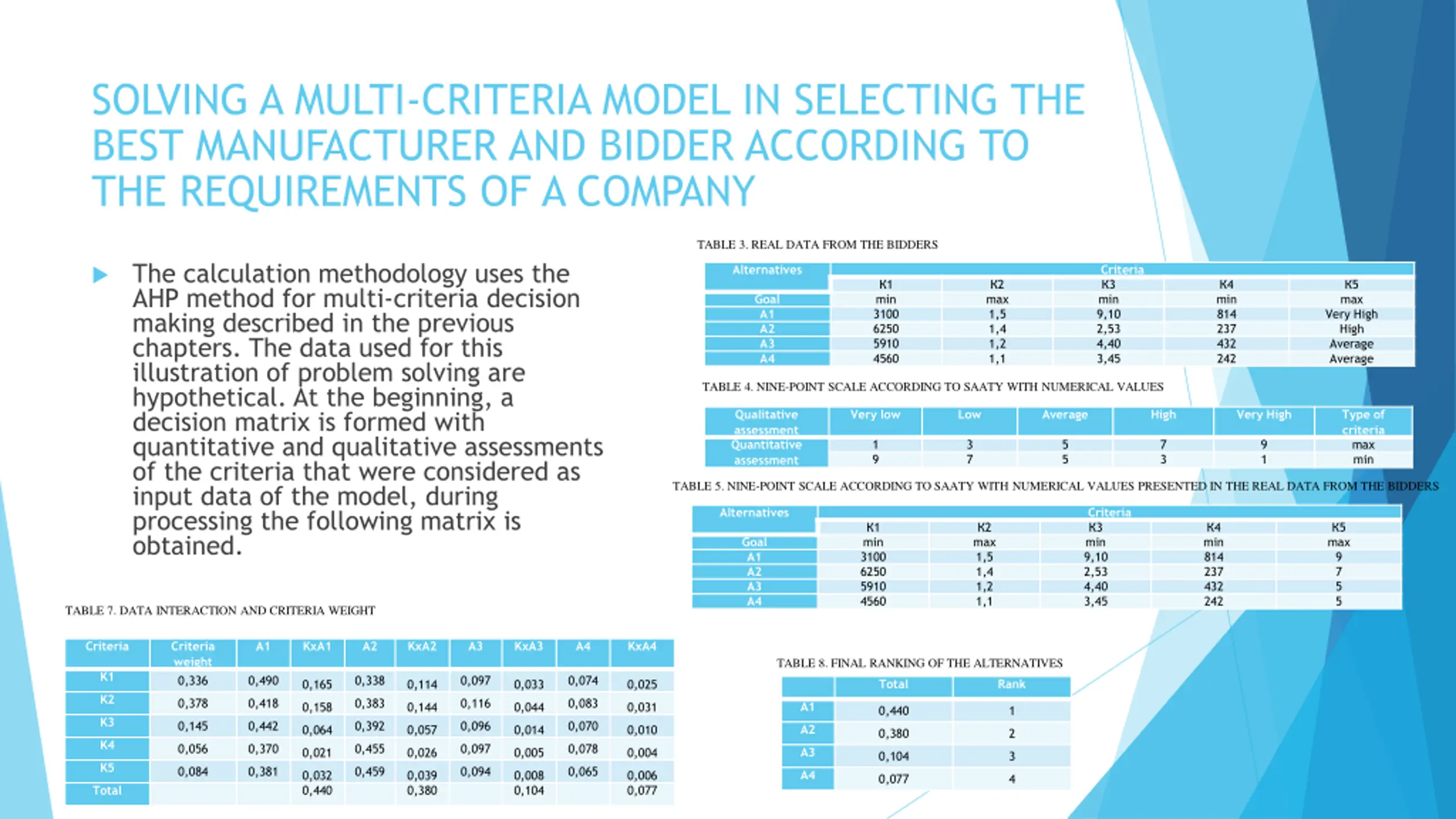 SOLVING A MULTI-CRITERIA MODEL IN SELECTING THE BEST MANUFACTURER AND BIDDER ACCORDING TO THE REQUIREMENTS OF A COMPANY TABLE 3. REAL DATA FROM THE BIDDERS The calculation methodology uses the AHP method for multi-criteria decision making described in the previous chapters. The data used for this illustration of problem solving are hypothetical. At the beginning, a decision matrix is formed with quantitative and qualitative assessments of the criteria that were considered as input data of the model, during processing the following matrix is obtained. Alternatives Criteria 3 min 9,10 2,53 4,40 3,45 1 min 3100 6250 5910 4560 2 max 1,5 1,4 1,2 1,1 4 min 814 237 432 242 5 max Goal 1 2 3 4 Very High High Average Average TABLE 4. NINE-POINT SCALE ACCORDING TO SAATY WITH NUMERICAL VALUES Qualitative assessment Quantitative assessment Very low Low Average High Very High Type of criteria max min 1 9 3 7 5 5 7 3 9 1 TABLE 5. NINE-POINT SCALE ACCORDING TO SAATY WITH NUMERICAL VALUES PRESENTED IN THE REAL DATA FROM THE BIDDERS Alternatives Criteria 3 min 9,10 2,53 4,40 3,45 1 min 3100 6250 5910 4560 2 max 1,5 1,4 1,2 1,1 4 min 814 237 432 242 5 max 9 7 5 5 Goal 1 2 3 4 TABLE 7. DATA INTERACTION AND CRITERIA WEIGHT Criteria Criteria weight 0,336 1 KxA1 A2 KxA2 A3 KxA3 A4 KxA4 TABLE 8. FINAL RANKING OF THE ALTERNATIVES K1 0,490 0,338 0,097 0,074 Total Rank 0,165 0,114 0,033 0,025 K2 0,378 0,418 0,383 0,116 0,083 1 0,158 0,144 0,044 0,031 0,440 1 K3 0,145 0,442 0,392 0,096 0,070 2 0,064 0,057 0,014 0,010 0,380 2 K4 0,056 0,370 0,455 0,097 0,078 3 0,021 0,026 0,005 0,004 0,104 3 K5 0,084 0,381 0,459 0,094 0,065 4 0,032 0,440 0,039 0,380 0,008 0,104 0,006 0,077 0,077 4 Total