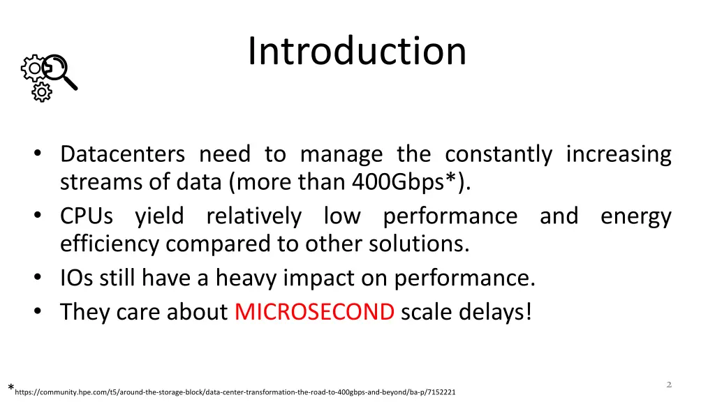 Introduction Datacenters need to manage the constantly increasing streams of data (more than 400Gbps*). CPUs yield relatively low performance and energy efficiency compared to other solutions. IOs still have a heavy impact on performance. They care about MICROSECOND scale delays! 2 *https://community.hpe.com/t5/around-the-storage-block/data-center-transformation-the-road-to-400gbps-and-beyond/ba-p/7152221
