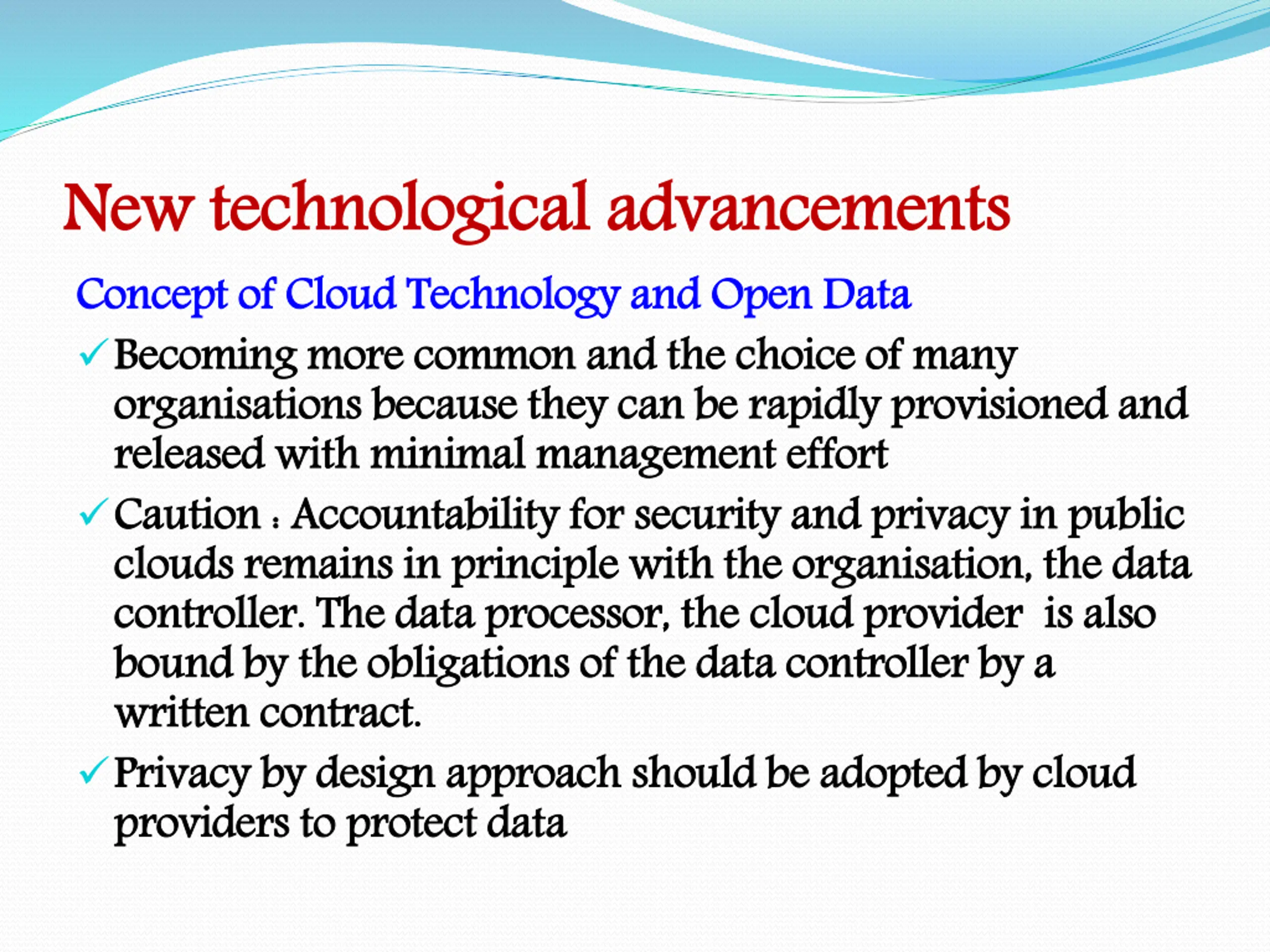 New technological advancements Concept of Cloud Technology and Open Data Becoming more common and the choice of many organisations because they can be rapidly provisioned and released with minimal management effort Caution : Accountability for security and privacy in public clouds remains in principle with the organisation, the data controller. The data processor, the cloud provider is also bound by the obligations of the data controller by a written contract. Privacy by design approach should be adopted by cloud providers to protect data New technological advancements Concept of Cloud Technology and Open Data Becoming more common and the choice of many organisations because they can be rapidly provisioned and released with minimal management effort Caution : Accountability for security and privacy in public clouds remains in principle with the organisation, the data controller. The data processor, the cloud provider is also bound by the obligations of the data controller by a written contract. Privacy by design approach should be adopted by cloud providers to protect data