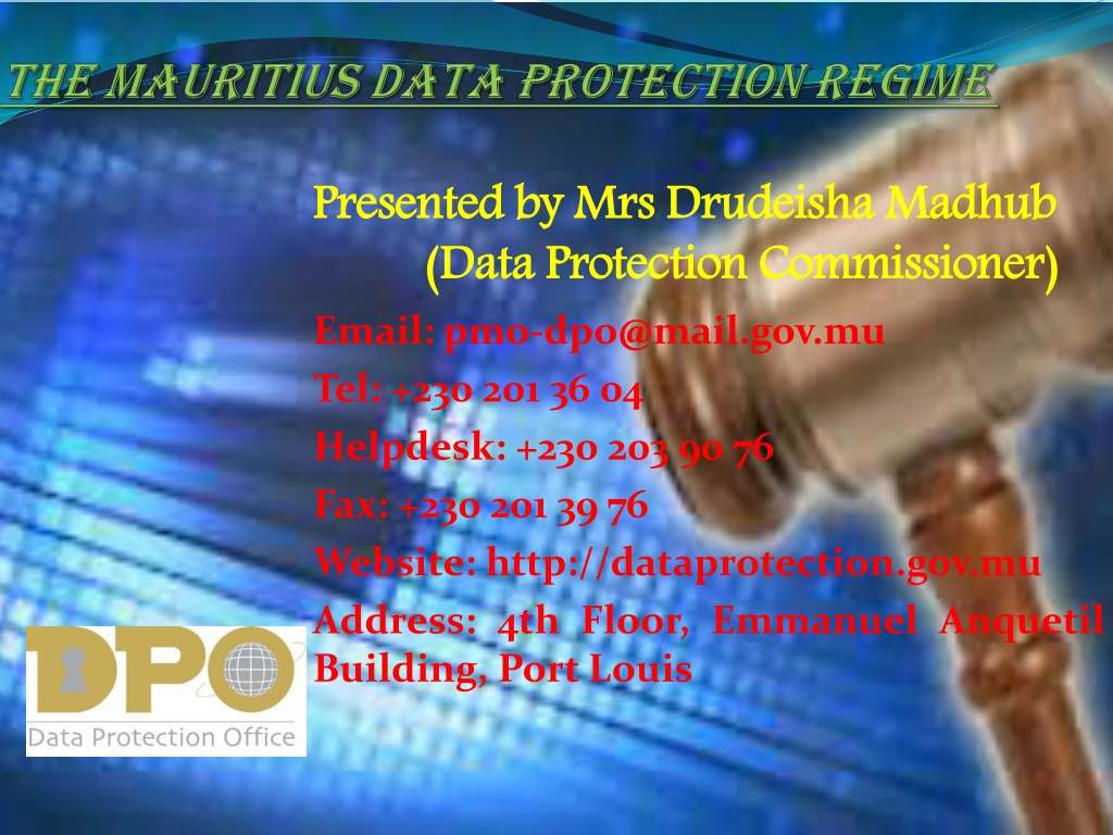 Presented Presented by (Data Email: pmo-dpo@mail.gov.mu Tel: +230 201 36 04 Helpdesk: +230 203 90 76 Fax: +230 201 39 76 Website: http://dataprotection.gov.mu Address: 4th Floor, Emmanuel Anquetil Building, Port Louis Mrs Drudeisha (Data Protection by Mrs Protection Commissioner) Drudeisha Madhub Commissioner) Madhub