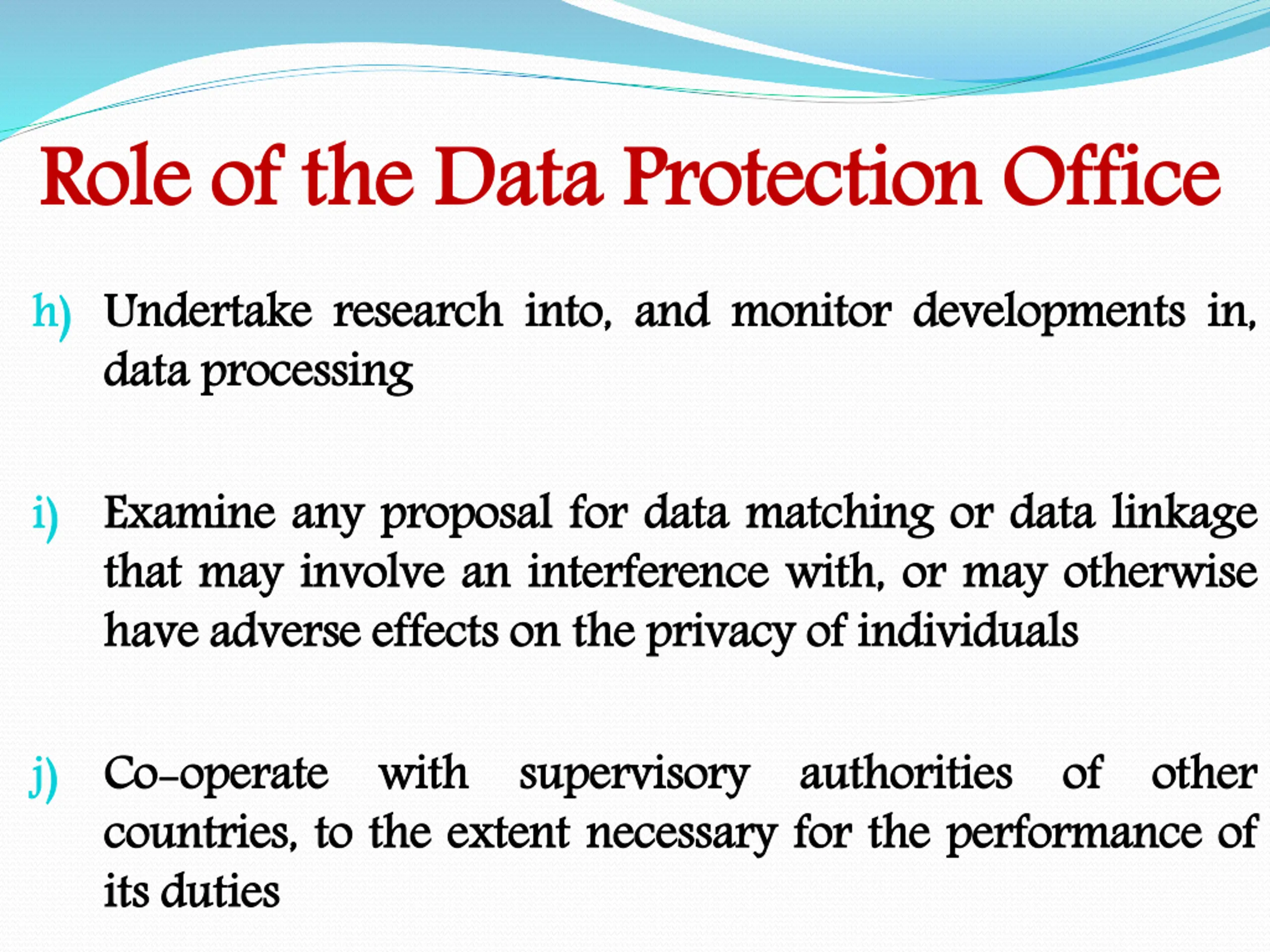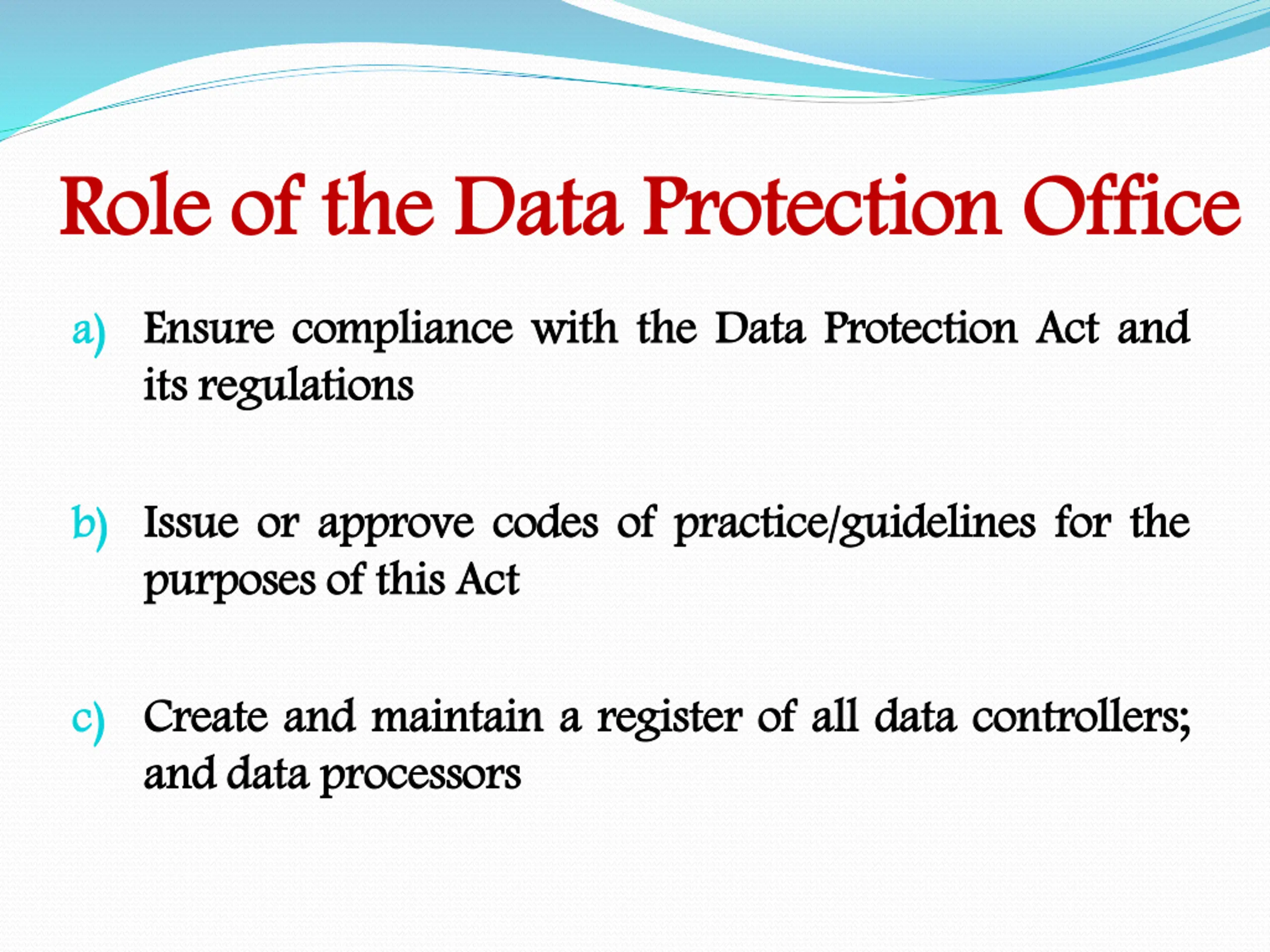 Role a) a) Ensure its Role of the Data Protection Office Ensure compliance its regulations of the Data Protection Office compliance with regulations with the the Data Data Protection Protection Act Act and and b) b) Issue purposes Issue or or approve purposes of of this approve codes this Act codes of of practice/guidelines Act practice/guidelines for for the the c) c) Create and Create and and data and maintain data processors maintain a a register processors register of of all all data data controllers controllers; ;