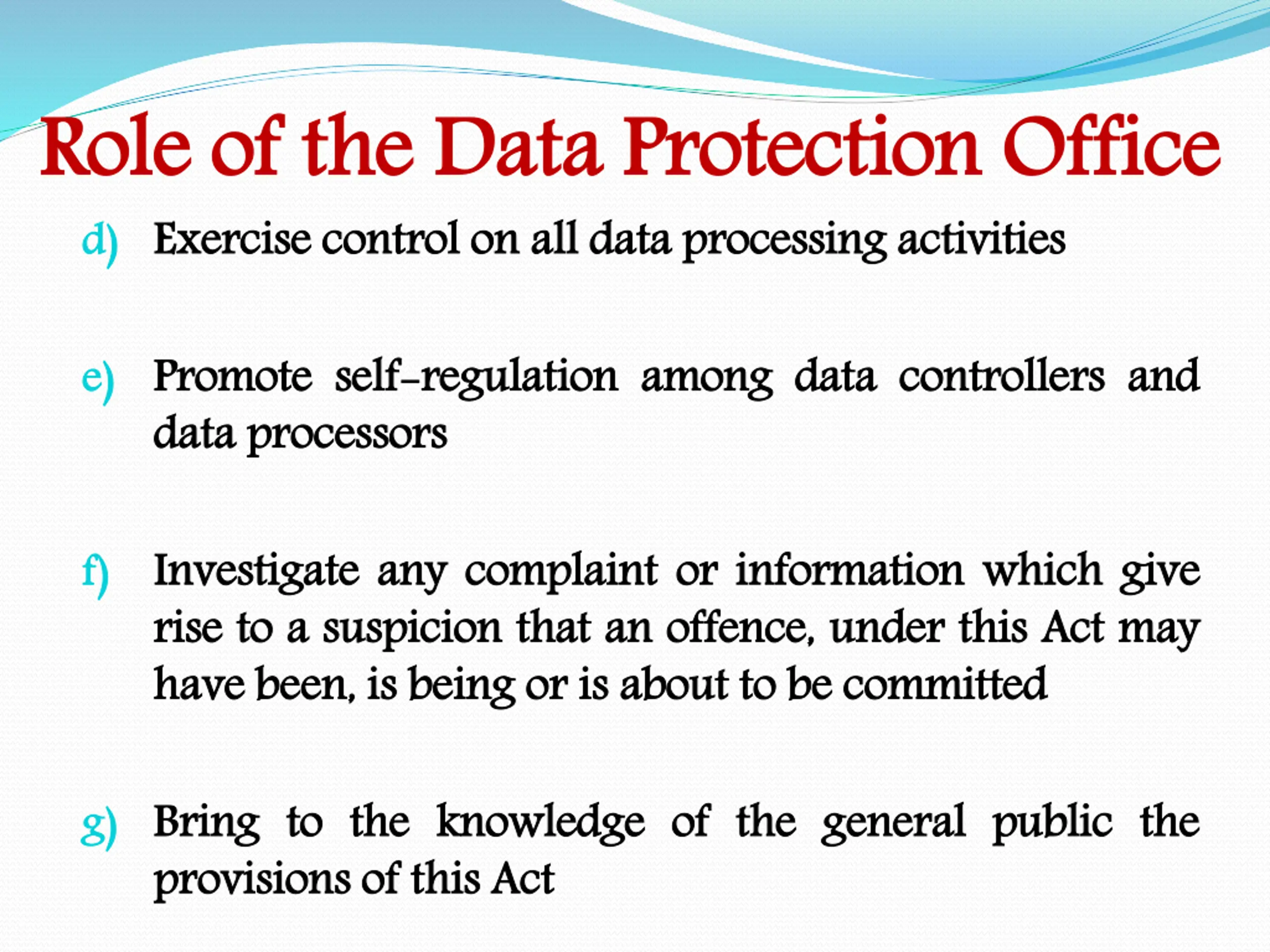 Role d) d) Exercise Role of the Data Protection Office Exercise control of the Data Protection Office control on on all all data data processing processing activities activities e) e) Promote data Promote self data processors self- -regulation processors regulation among among data data controllers controllers and and Investigate rise have Investigate any rise to to a a suspicion have been, any complaint suspicion that been, is is being complaint or or information that an being or or is is about information which an offence, about to to be which give this Act committed give may f) f) offence, under be committed under this Act may g) g) Bring provisions Bring to to the provisions of of this the knowledge this Act knowledge of of the Act the general general public public the the