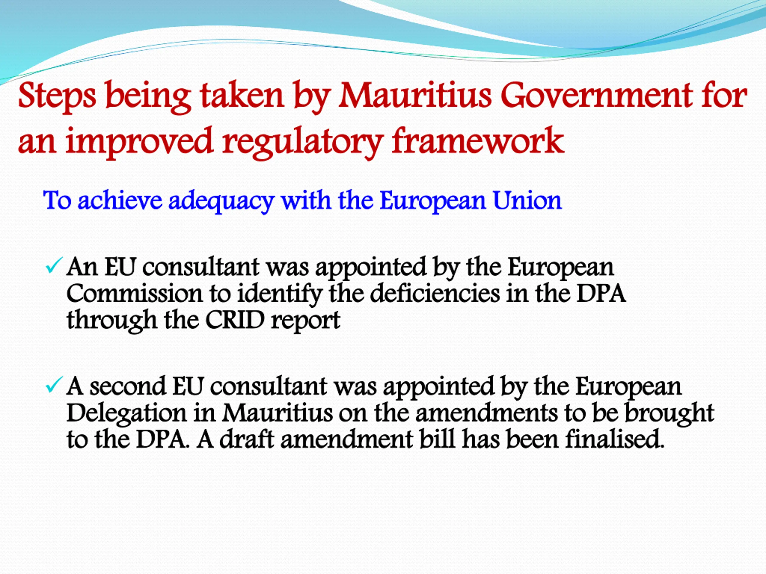 Steps being taken by Mauritius Government for an improved regulatory framework To achieve adequacy with the European Union Steps being taken by Mauritius Government for an improved regulatory framework To achieve adequacy with the European Union An EU consultant was appointed by the European Commission to identify the deficiencies in the DPA through the CRID report An EU consultant was appointed by the European Commission to identify the deficiencies in the DPA through the CRID report A second EU consultant was appointed by the European Delegation in Mauritius on the amendments to be brought to the A second EU consultant was appointed by the European Delegation in Mauritius on the amendments to be brought to the DPA DPA. A draft amendment bill has been finalised. . A draft amendment bill has been finalised.