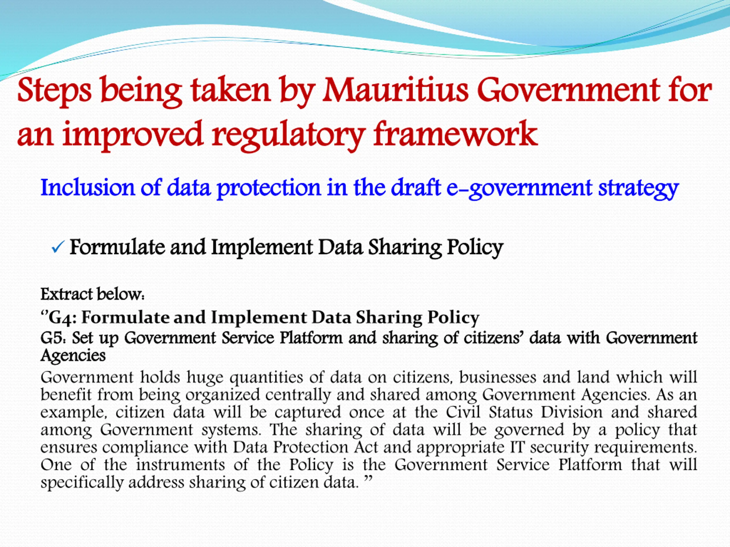 Steps being taken by Mauritius Government for an improved regulatory framework Inclusion of data protection in the draft e Steps being taken by Mauritius Government for an improved regulatory framework Inclusion of data protection in the draft e- -government strategy government strategy Formulate and Implement Data Sharing Policy Formulate and Implement Data Sharing Policy Extract G4: Formulateand ImplementData Sharing Policy G G5 5: : Set Agencies Government holds huge quantities of data on citizens, businesses and land which will benefit from being organized centrally and shared among Government Agencies. As an example, citizen data will be captured once at the Civil Status Division and shared among Government systems. The sharing of data will be governed by a policy that ensures compliance with Data Protection Act and appropriate IT security requirements. One of the instruments of the Policy is the Government Service Platform that will specifically address sharing of citizen data. Extract below below: : Set up up Government Government Service Service Platform Platform and and sharing sharing of of citizens citizens data data with with Government Government Agencies