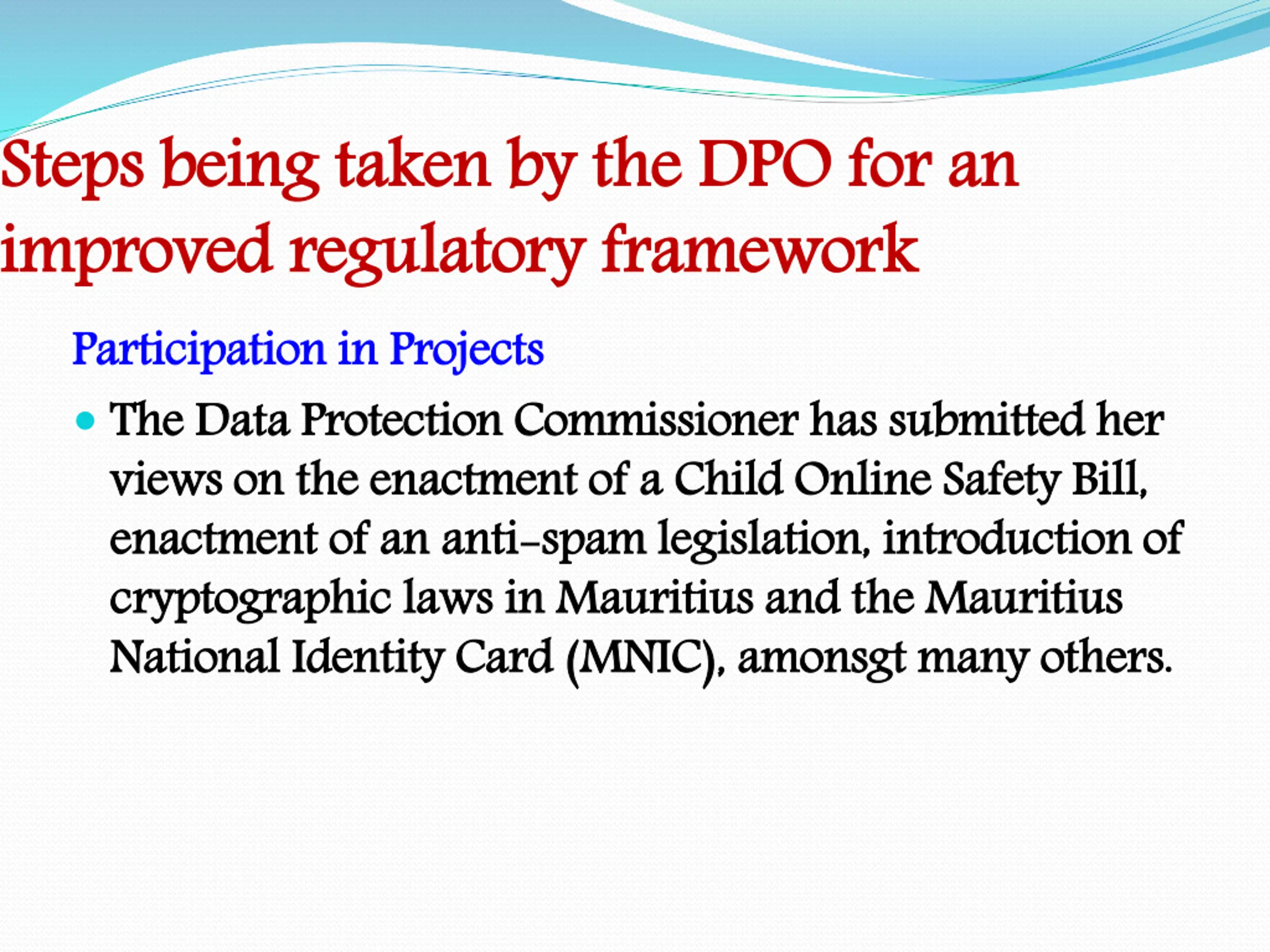 Steps being taken by the improved regulatory framework Participation in Projects The Data Protection Commissioner has submitted her views on the enactment of a Child Online Safety Bill, enactment of an anti cryptographic laws in Mauritius and the Mauritius National Identity Card ( Steps being taken by the DPO improved regulatory framework Participation in Projects The Data Protection Commissioner has submitted her views on the enactment of a Child Online Safety Bill, enactment of an anti- -spam legislation, introduction of cryptographic laws in Mauritius and the Mauritius National Identity Card (MNIC DPO for an for an spam legislation, introduction of MNIC), ), amonsgt amonsgt many others. many others.