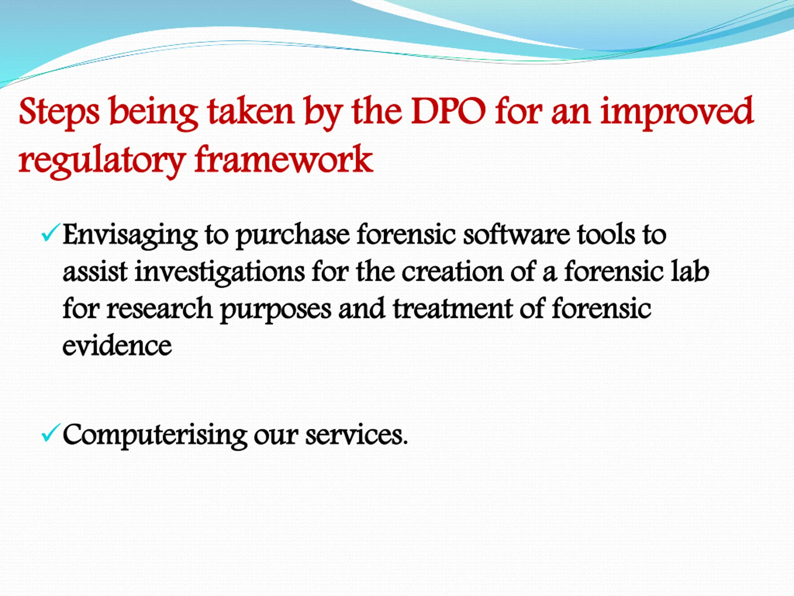 Steps being taken by the regulatory framework Steps being taken by the D DPO regulatory framework PO for an improved for an improved Envisaging to purchase forensic software tools to assist investigations for the creation of a forensic lab for research purposes and treatment of forensic evidence Envisaging to purchase forensic software tools to assist investigations for the creation of a forensic lab for research purposes and treatment of forensic evidence Computerising our services. Computerising our services.
