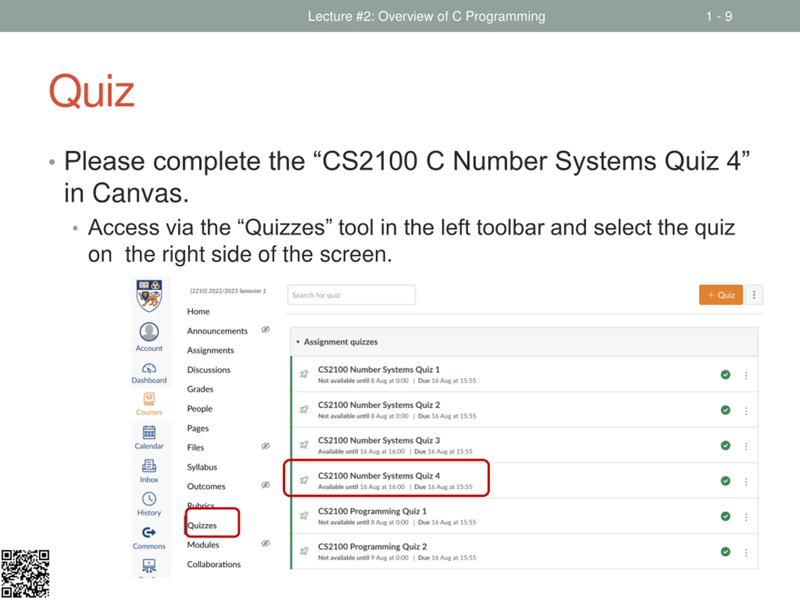 Lecture #2: Overview of C Programming 1 - 9 Quiz Please complete the CS2100 C Number Systems Quiz 4 in Canvas. Access via the Quizzes tool in the left toolbar and select the quiz on the right side of the screen.