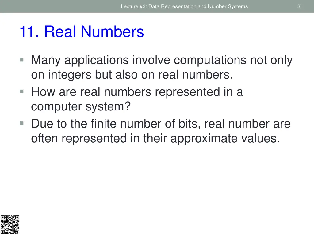 Lecture #3: Data Representation and Number Systems 3 11. Real Numbers Many applications involve computations not only on integers but also on real numbers. How are real numbers represented in a computer system? Due to the finite number of bits, real number are often represented in their approximate values.