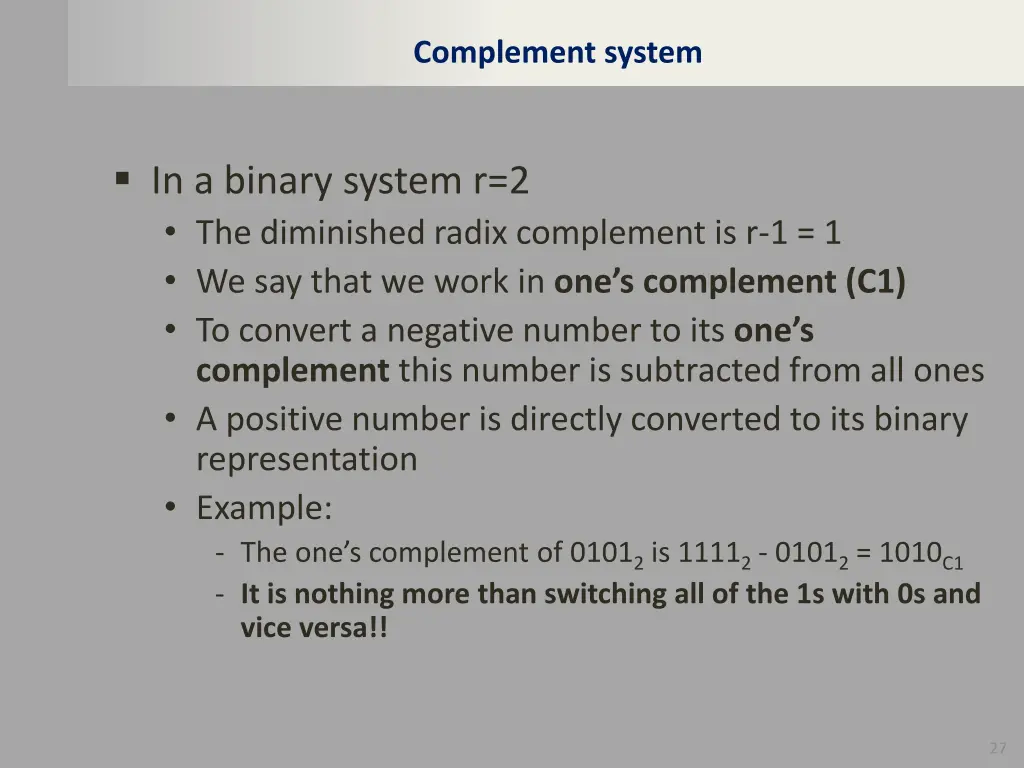 Complement system In a binary system r=2 The diminished radix complement is r-1 = 1 We say that we work in one s complement (C1) To convert a negative number to its one s complement this number is subtracted from all ones A positive number is directly converted to its binary representation Example: - The one s complement of 01012is 11112- 01012= 1010C1 - It is nothing more than switching all of the 1s with 0s and vice versa!! 27