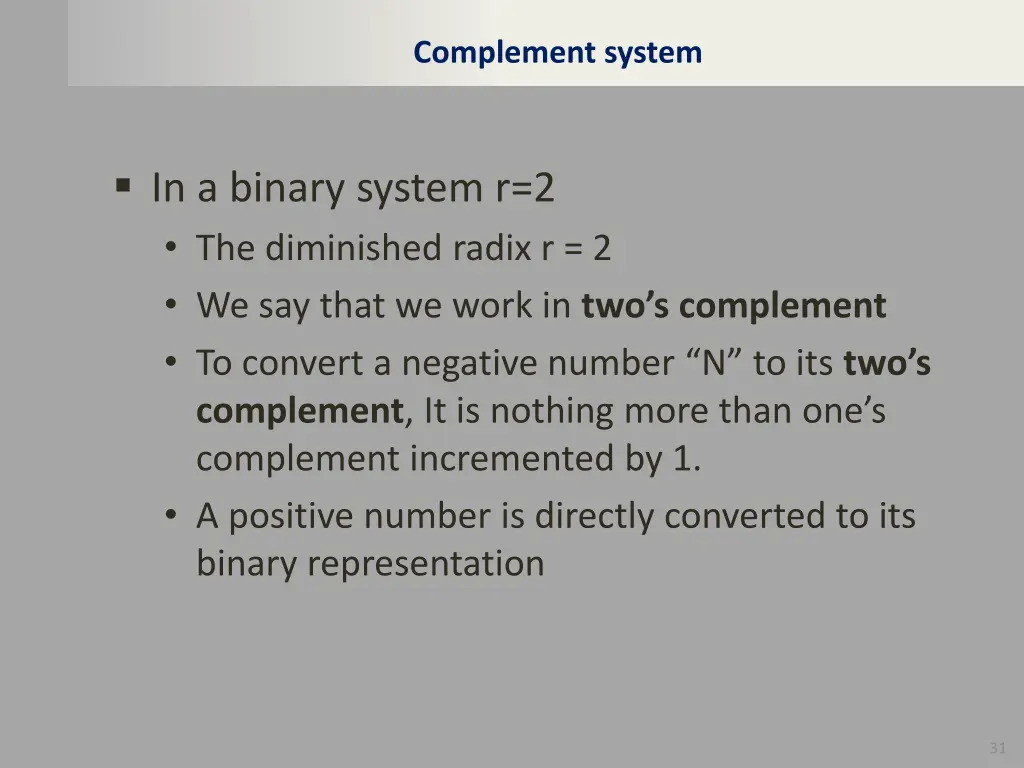 Complement system In a binary system r=2 The diminished radix r = 2 We say that we work in two s complement To convert a negative number N to its two s complement, It is nothing more than one s complement incremented by 1. A positive number is directly converted to its binary representation 31