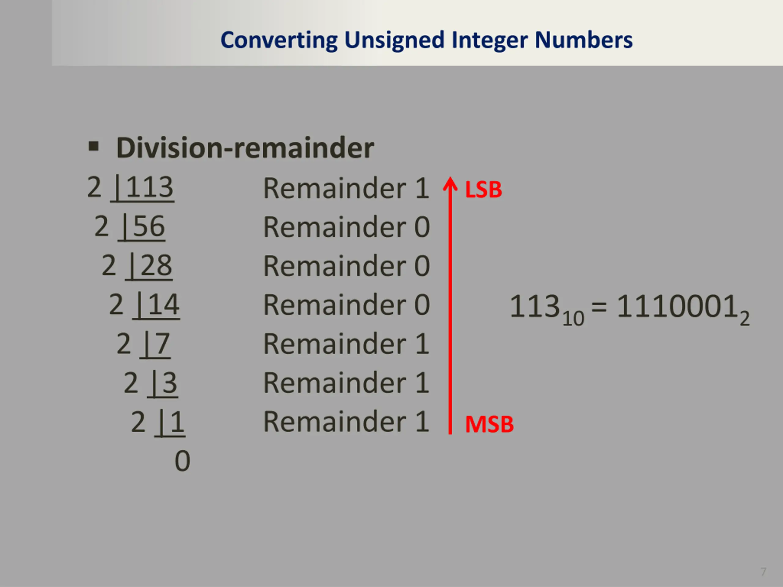 Converting Unsigned Integer Numbers Division-remainder 2 |113 2 |56 2 |28 2 |14 2 |7 2 |3 2 |1 0 Remainder 1 Remainder 0 Remainder 0 Remainder 0 Remainder 1 Remainder 1 Remainder 1 LSB 11310 = 11100012 MSB 7