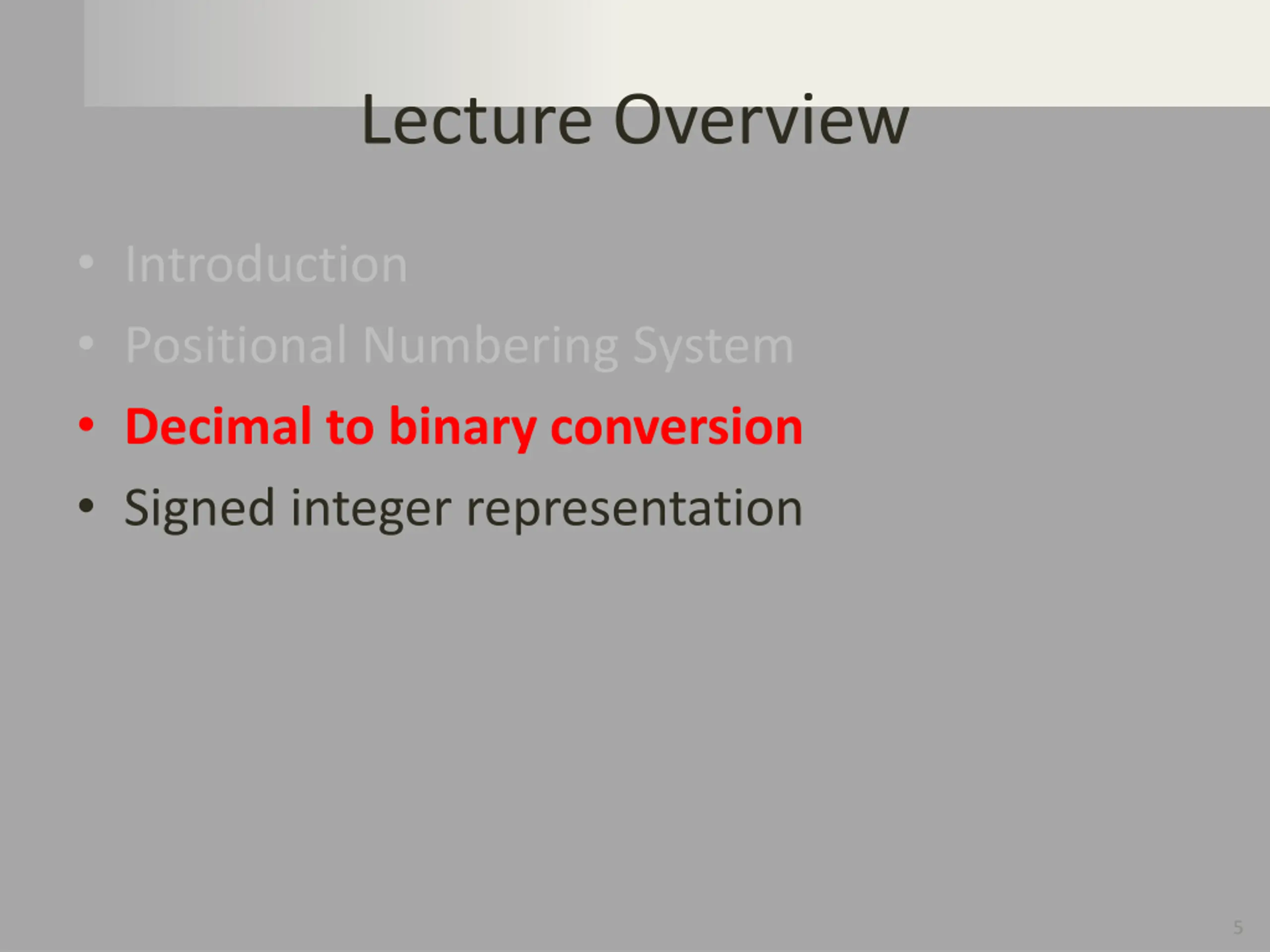 Lecture Overview Introduction Positional Numbering System Decimal to binary conversion Signed integer representation 5