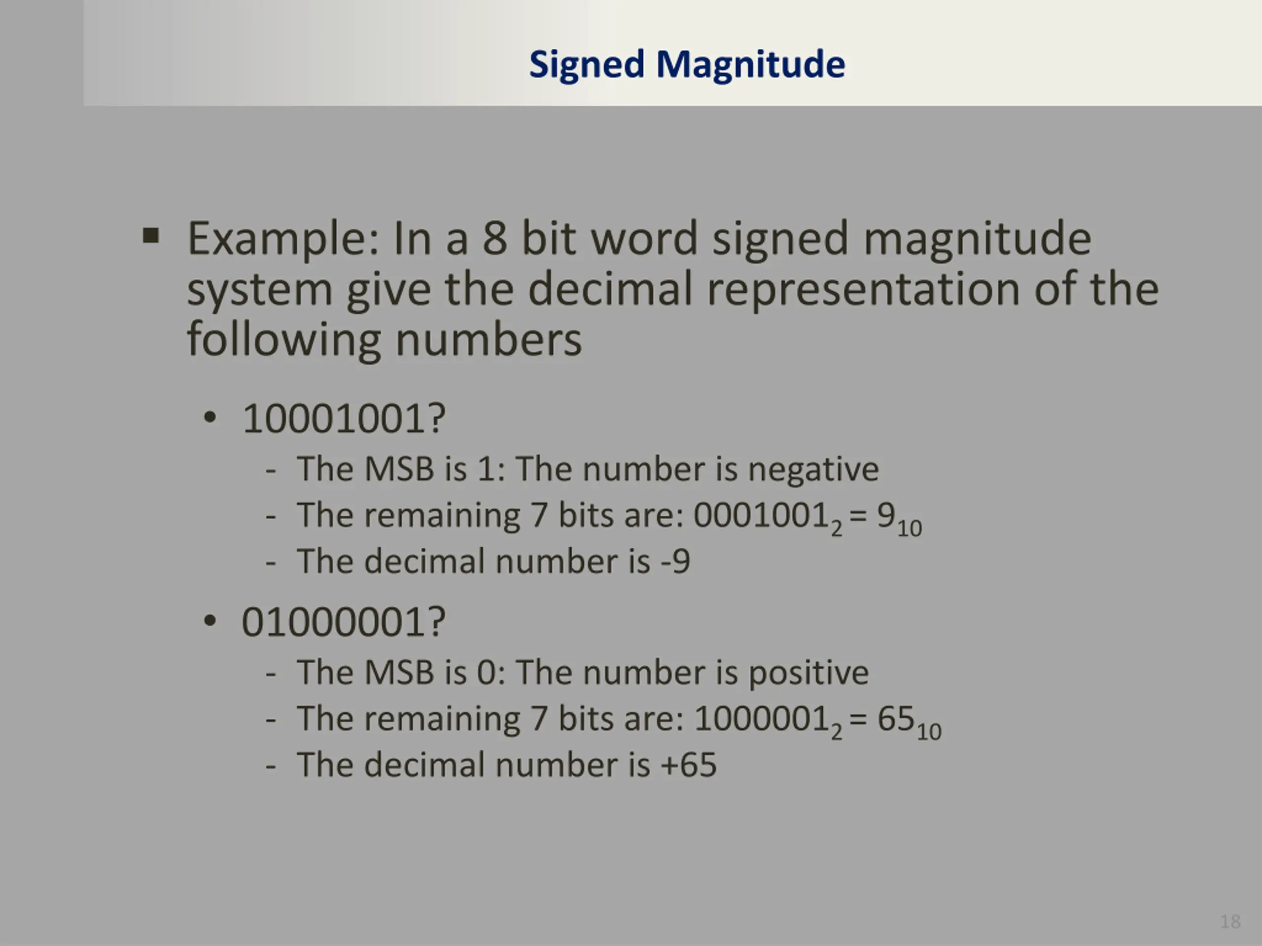 Signed Magnitude Example: In a 8 bit word signed magnitude system give the decimal representation of the following numbers 00000001? - The MSB is 0: The number is positive - The remaining 7 bits are: 00000012 = 110 - The decimal number is +1 10000001? - The MSB is 1: The number is negative - The remaining 7 bits are: 00000012 = 110 - The decimal number is -1 17