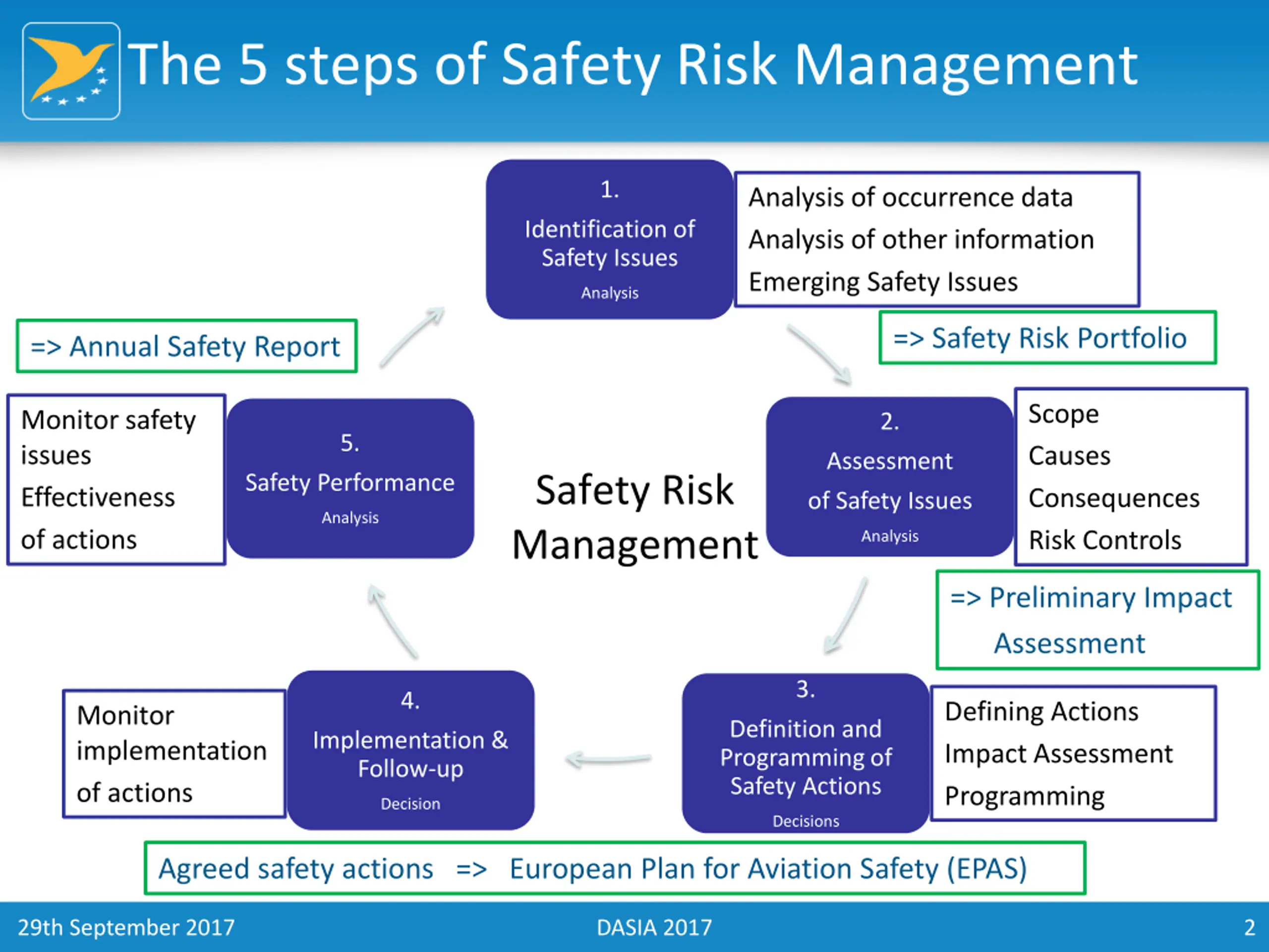 The 5 steps of Safety Risk Management 1. Analysis of occurrence data Analysis of other information Emerging Safety Issues Identification of Safety Issues Analysis => Safety Risk Portfolio => Annual Safety Report Scope Causes Consequences Risk Controls Monitor safety issues Effectiveness of actions 2. 5. Assessment of Safety Issues Safety Risk Management Safety Performance Analysis Analysis => Preliminary Impact Assessment 3. 4. Defining Actions Impact Assessment Programming Monitor implementation of actions Definition and Programming of Safety Actions Implementation & Follow-up Decision Decisions Agreed safety actions => European Plan for Aviation Safety (EPAS) 29th September 2017 DASIA 2017 2