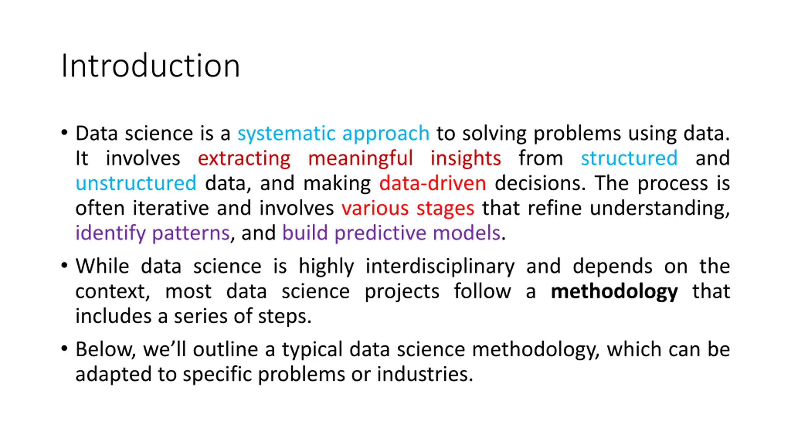 Introduction Data science is a systematic approach to solving problems using data. It involves extracting meaningful insights from structured and unstructured data, and making data-driven decisions. The process is often iterative and involves various stages that refine understanding, identify patterns, and build predictive models. While data science is highly interdisciplinary and depends on the context, most data science projects follow a methodology that includes a series of steps. Below, we ll outline a typical data science methodology, which can be adapted to specific problems or industries.