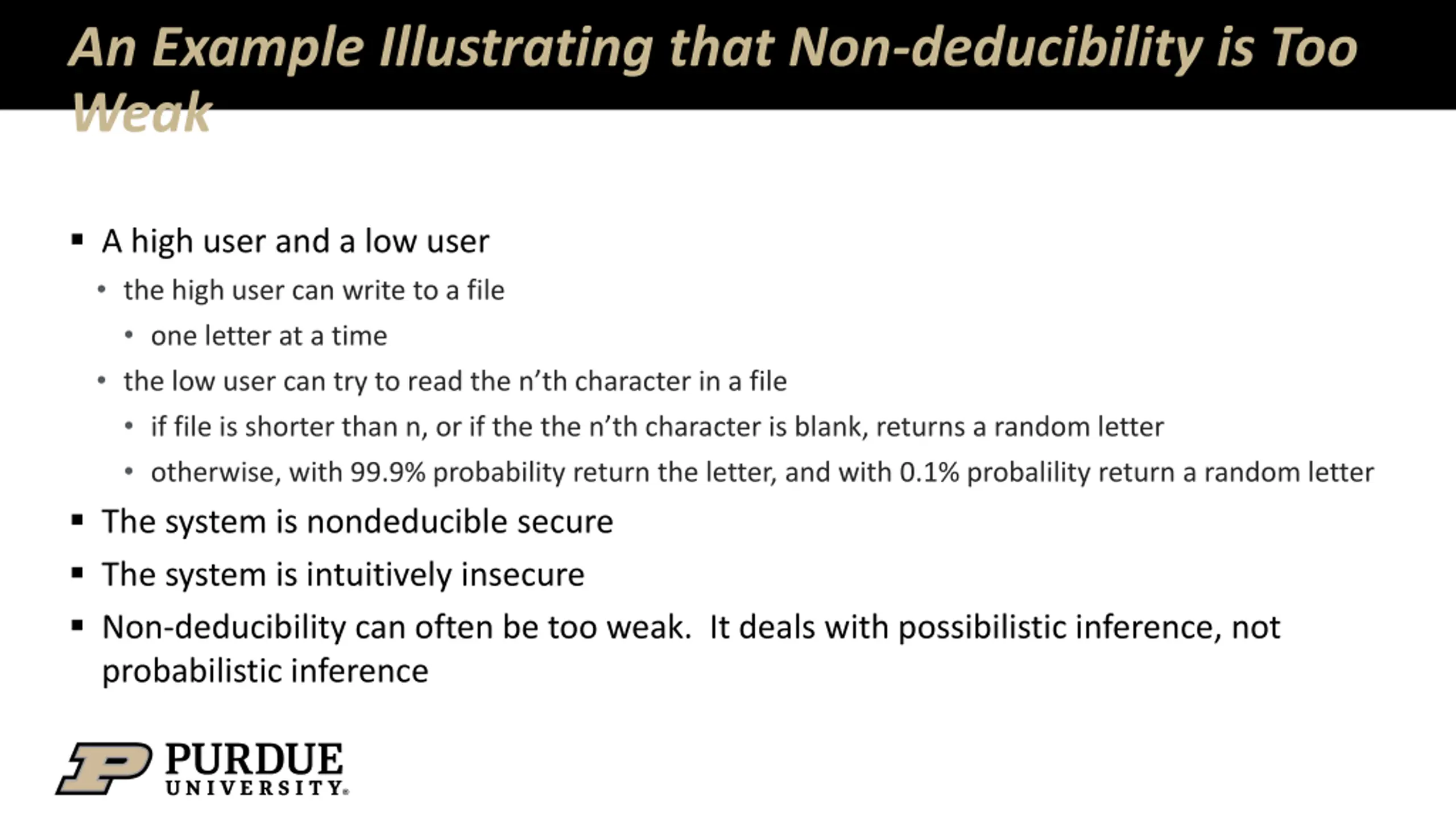 An Example Illustrating that Non-deducibility is Too Weak A high user and a low user the high user can write to a file one letter at a time the low user can try to read the n th character in a file if file is shorter than n, or if the the n th character is blank, returns a random letter otherwise, with 99.9% probability return the letter, and with 0.1% probalility return a random letter The system is nondeducible secure The system is intuitively insecure Non-deducibility can often be too weak. It deals with possibilistic inference, not probabilistic inference