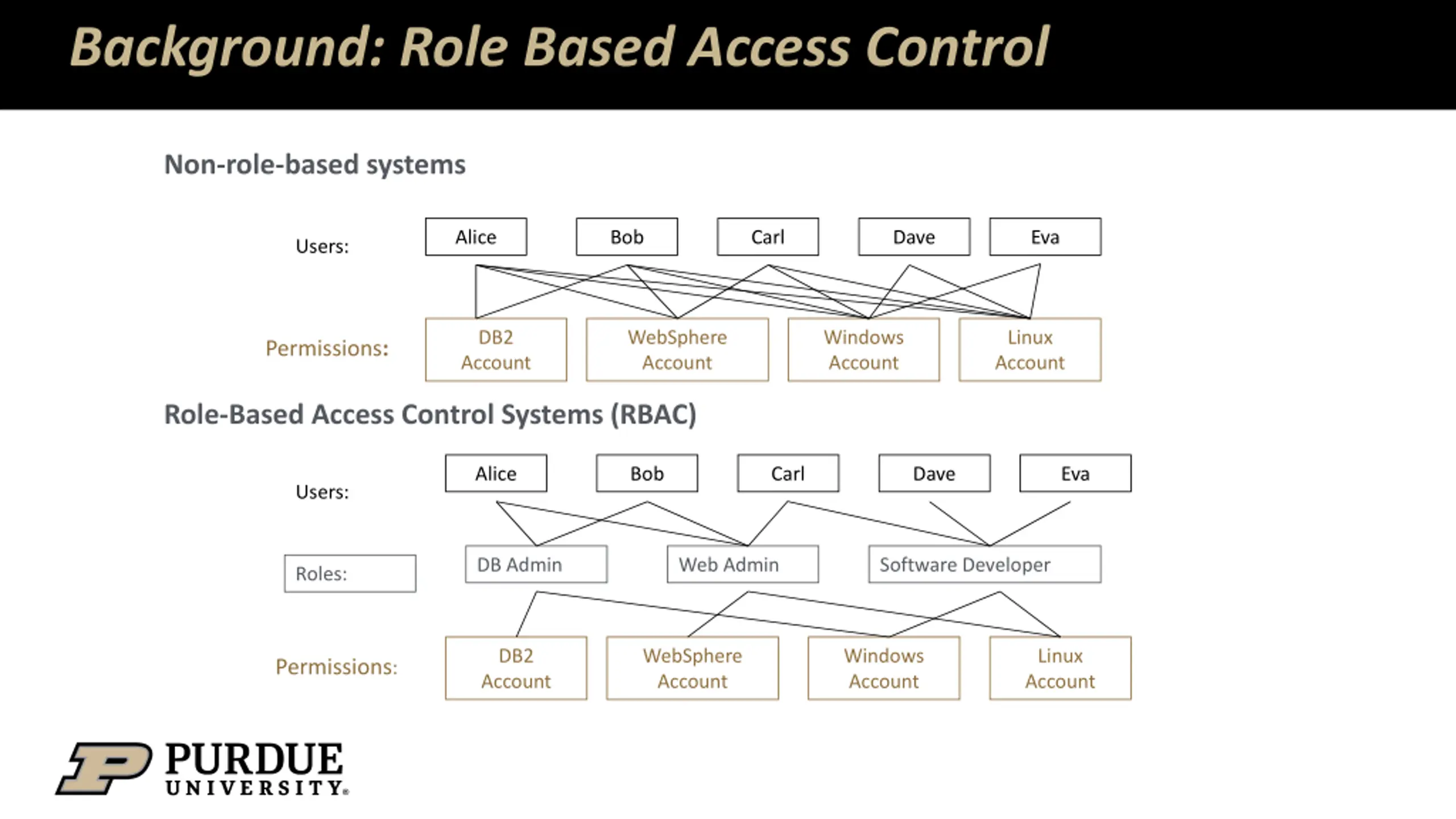 Background: Role Based Access Control Non-role-based systems Alice Bob Carl Dave Eva Users: DB2 Account WebSphere Account Windows Account Linux Account Permissions: Role-Based Access Control Systems (RBAC) Alice Bob Carl Dave Eva Users: DB Admin Web Admin Software Developer Roles: DB2 Account WebSphere Account Windows Account Linux Account Permissions: