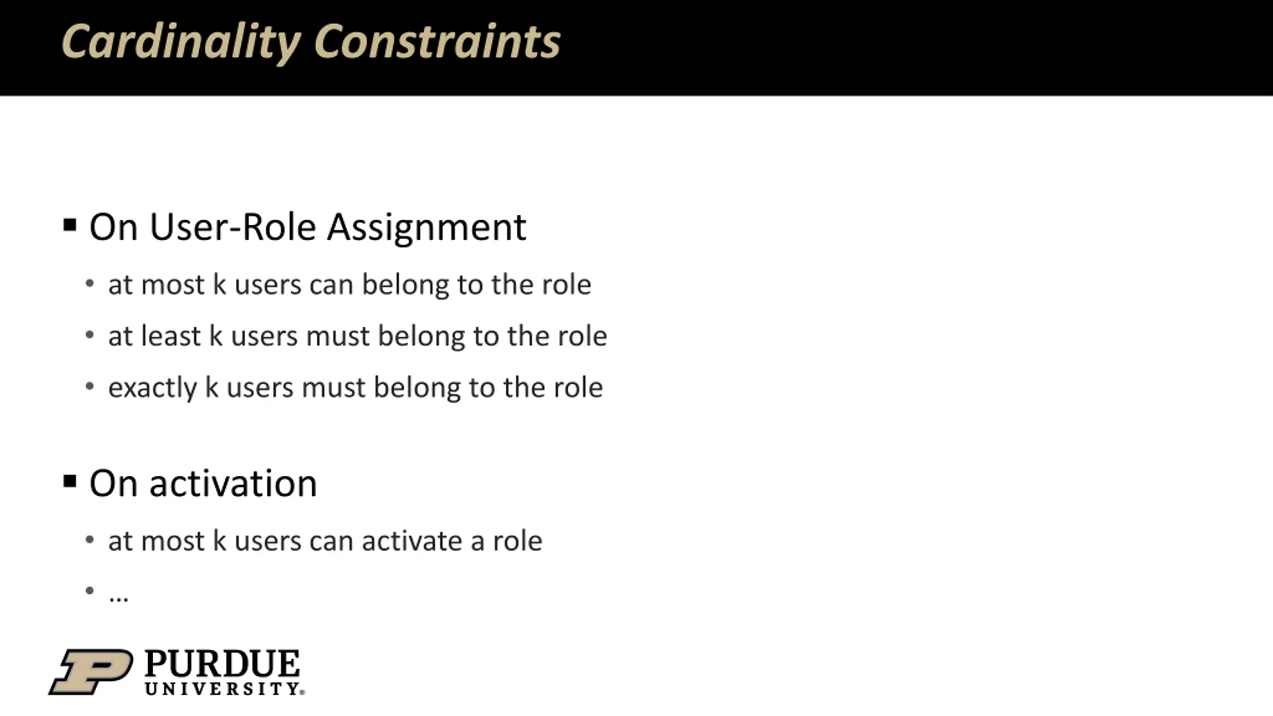Cardinality Constraints On User-Role Assignment at most k users can belong to the role at least k users must belong to the role exactly k users must belong to the role On activation at most k users can activate a role