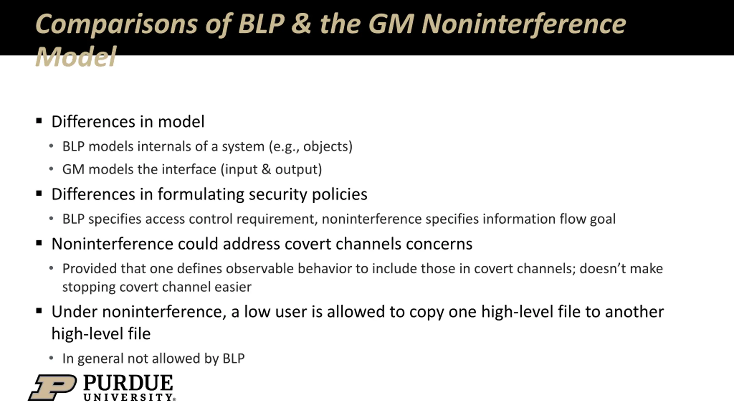Comparisons of BLP & the GM Noninterference Model Differences in model BLP models internals of a system (e.g., objects) GM models the interface (input & output) Differences in formulating security policies BLP specifies access control requirement, noninterference specifies information flow goal Noninterference could address covert channels concerns Provided that one defines observable behavior to include those in covert channels; doesn t make stopping covert channel easier Under noninterference, a low user is allowed to copy one high-level file to another high-level file In general not allowed by BLP