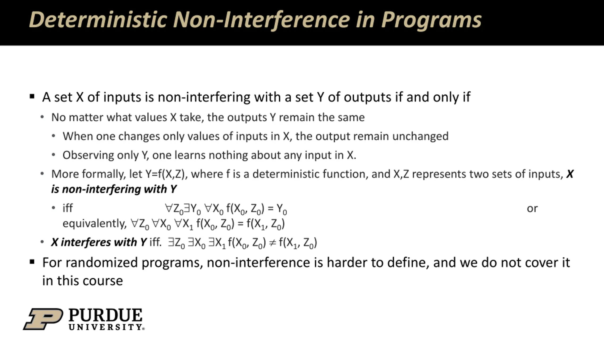 Deterministic Non-Interference in Programs A set X of inputs is non-interfering with a set Y of outputs if and only if No matter what values X take, the outputs Y remain the same When one changes only values of inputs in X, the output remain unchanged Observing only Y, one learns nothing about any input in X. More formally, let Y=f(X,Z), where f is a deterministic function, and X,Z represents two sets of inputs, X is non-interfering with Y iff Z0 Y0 X0 f(X0, Z0) = Y0 equivalently, Z0 X0 X1 f(X0, Z0) = f(X1, Z0) X interferes with Y iff. Z0 X0 X1 f(X0, Z0) f(X1, Z0) For randomized programs, non-interference is harder to define, and we do not cover it in this course or
