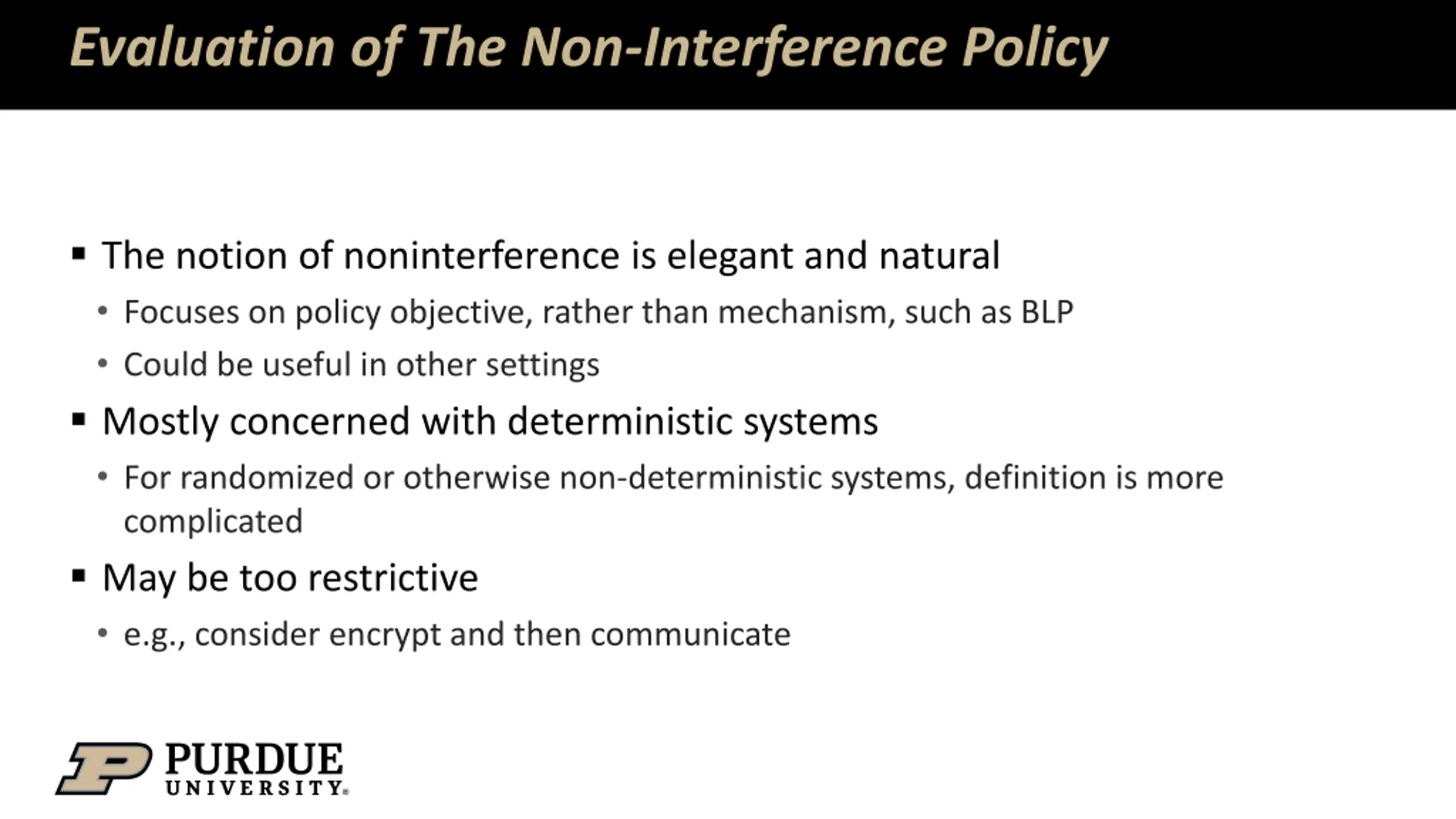 Evaluation of The Non-Interference Policy The notion of noninterference is elegant and natural Focuses on policy objective, rather than mechanism, such as BLP Could be useful in other settings Mostly concerned with deterministic systems For randomized or otherwise non-deterministic systems, definition is more complicated May be too restrictive e.g., consider encrypt and then communicate