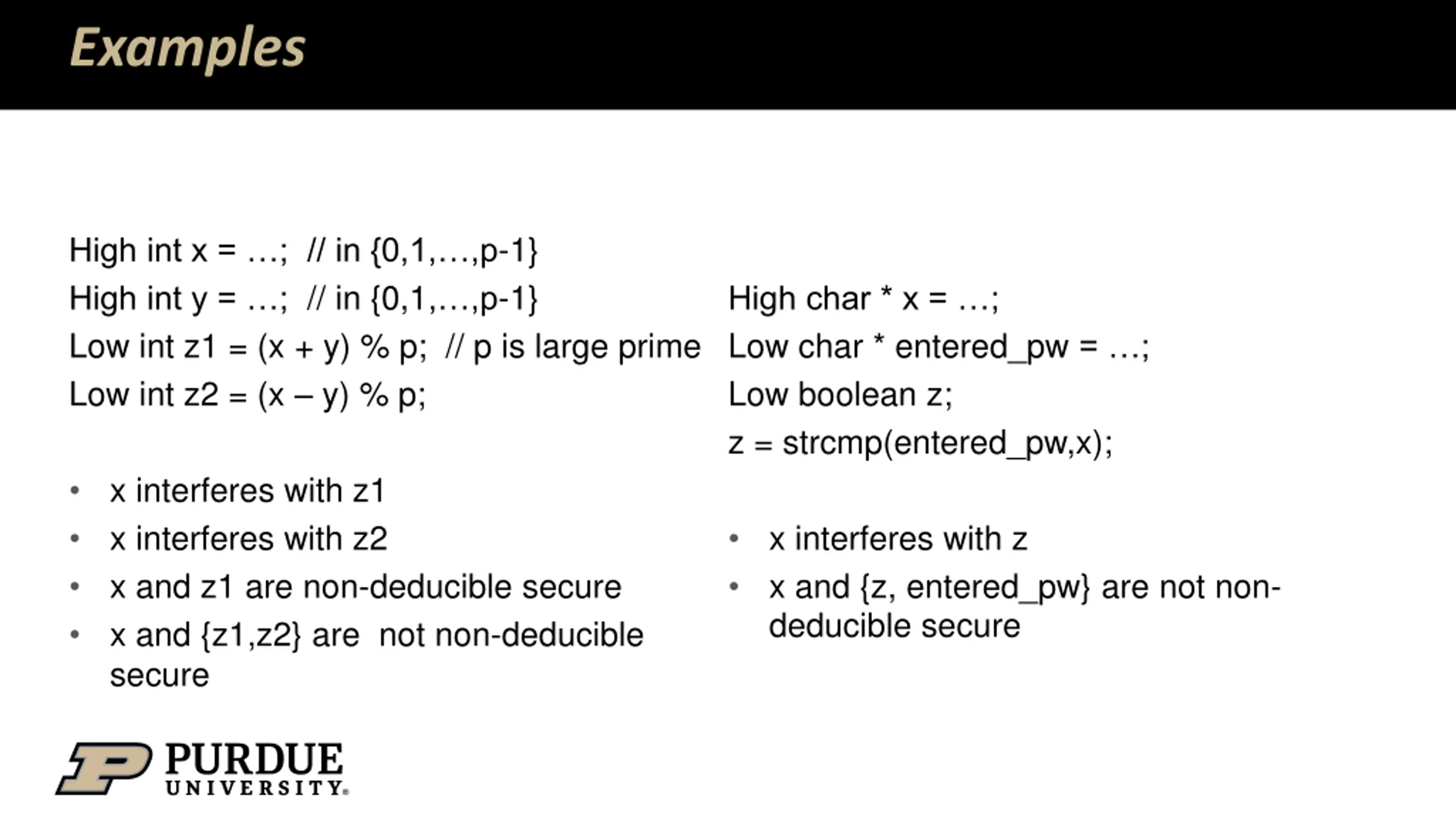 Examples High int x = ; // in {0,1, ,p-1} High int y = ; // in {0,1, ,p-1} Low int z1 = (x + y) % p; // p is large prime Low int z2 = (x y) % p; High char * x = ; Low char * entered_pw = ; Low boolean z; z = strcmp(entered_pw,x); x interferes with z1 x interferes with z2 x and z1 are non-deducible secure x and {z1,z2} are not non-deducible secure x interferes with z x and {z, entered_pw} are not non- deducible secure
