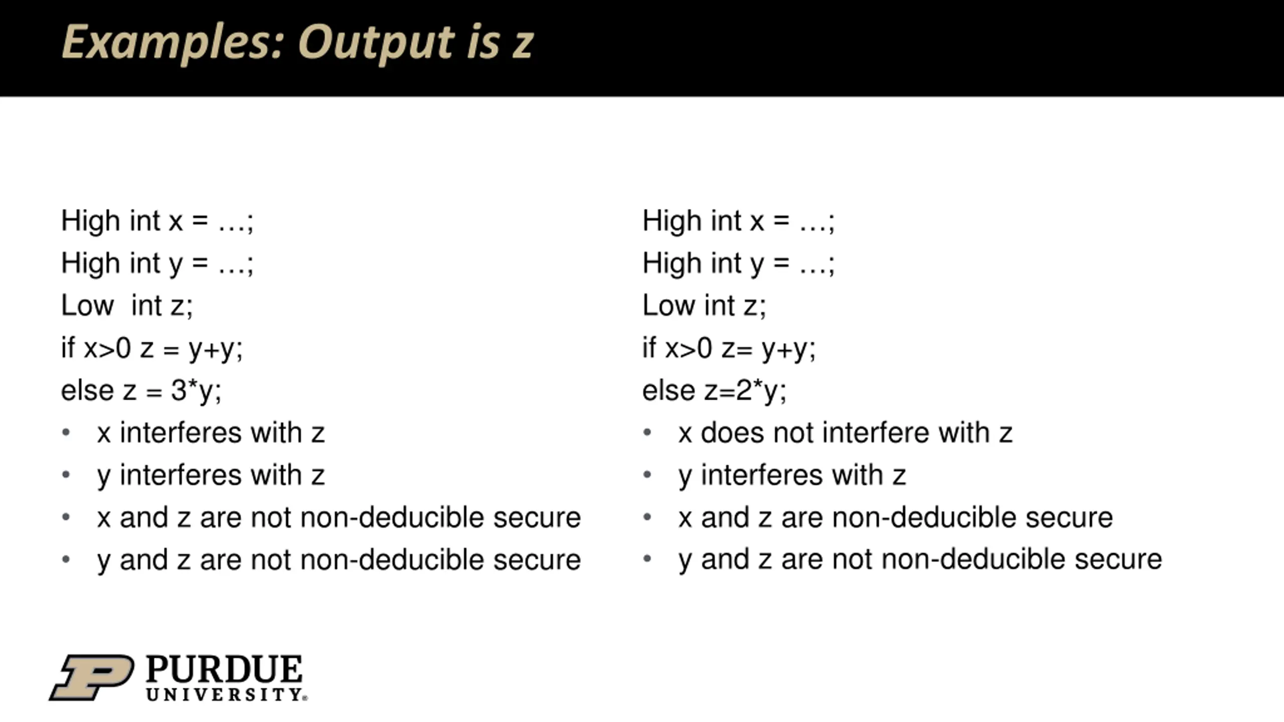 Examples: Output is z High int x = ; High int y = ; Low int z; if x>0 z = y+y; else z = 3*y; x interferes with z y interferes with z x and z are not non-deducible secure y and z are not non-deducible secure High int x = ; High int y = ; Low int z; if x>0 z= y+y; else z=2*y; x does not interfere with z y interferes with z x and z are non-deducible secure y and z are not non-deducible secure