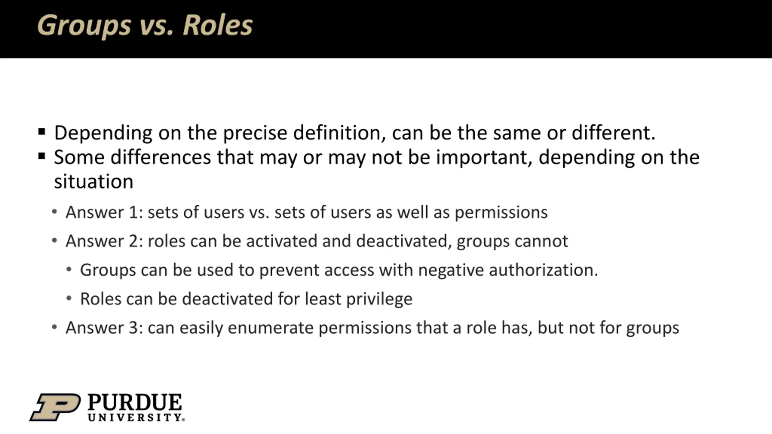 Groups vs. Roles Depending on the precise definition, can be the same or different. Some differences that may or may not be important, depending on the situation Answer 1: sets of users vs. sets of users as well as permissions Answer 2: roles can be activated and deactivated, groups cannot Groups can be used to prevent access with negative authorization. Roles can be deactivated for least privilege Answer 3: can easily enumerate permissions that a role has, but not for groups