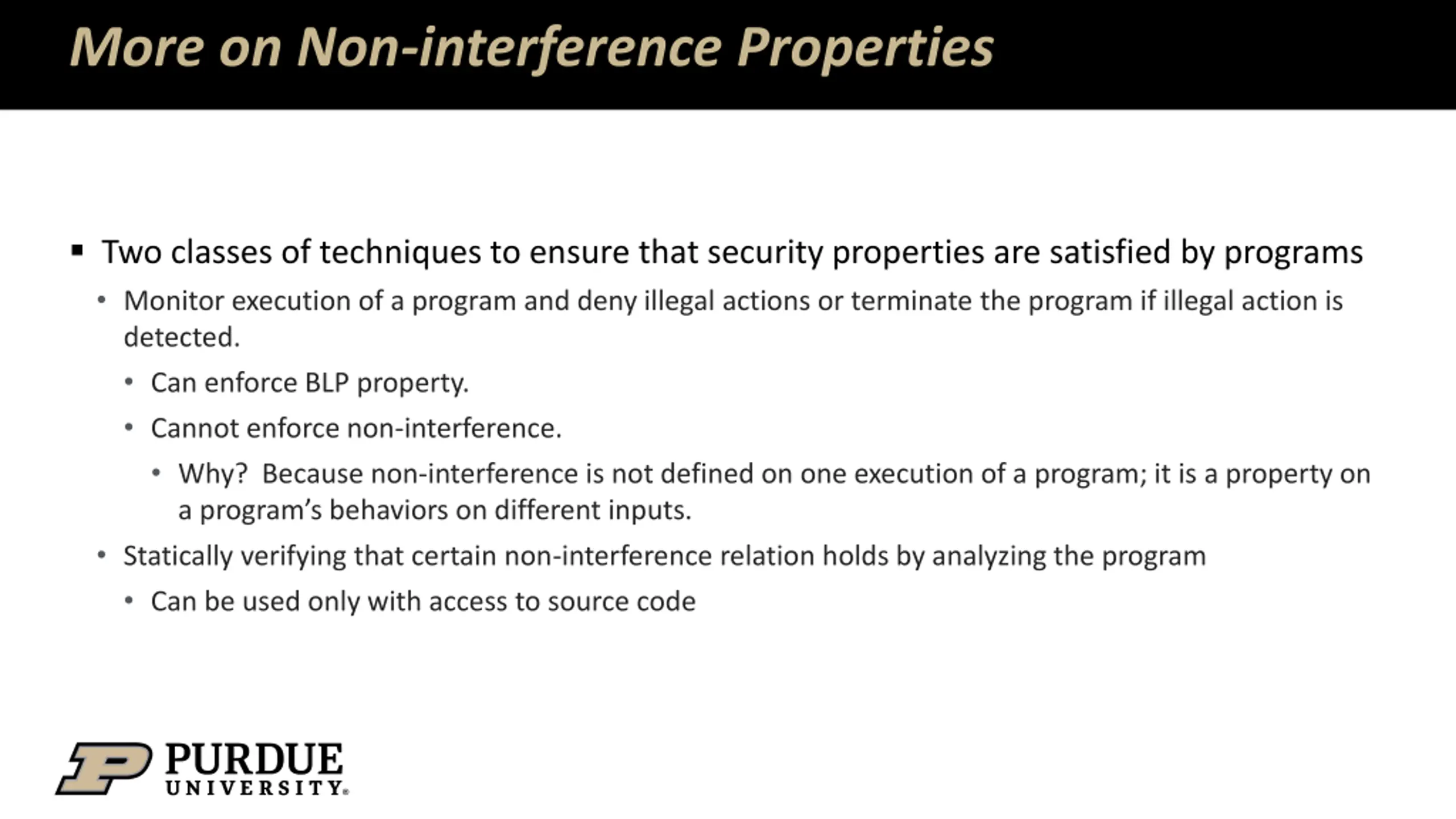 More on Non-interference Properties Two classes of techniques to ensure that security properties are satisfied by programs Monitor execution of a program and deny illegal actions or terminate the program if illegal action is detected. Can enforce BLP property. Cannot enforce non-interference. Why? Because non-interference is not defined on one execution of a program; it is a property on a program s behaviors on different inputs. Statically verifying that certain non-interference relation holds by analyzing the program Can be used only with access to source code