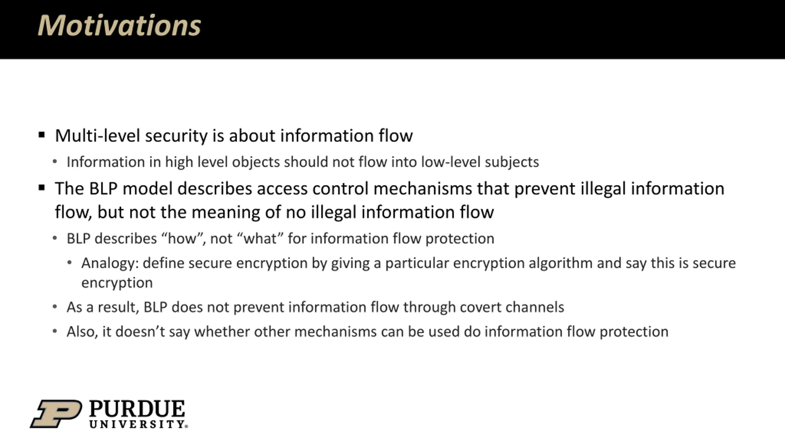 Motivations Multi-level security is about information flow Information in high level objects should not flow into low-level subjects The BLP model describes access control mechanisms that prevent illegal information flow, but not the meaning of no illegal information flow BLP describes how , not what for information flow protection Analogy: define secure encryption by giving a particular encryption algorithm and say this is secure encryption As a result, BLP does not prevent information flow through covert channels Also, it doesn t say whether other mechanisms can be used do information flow protection