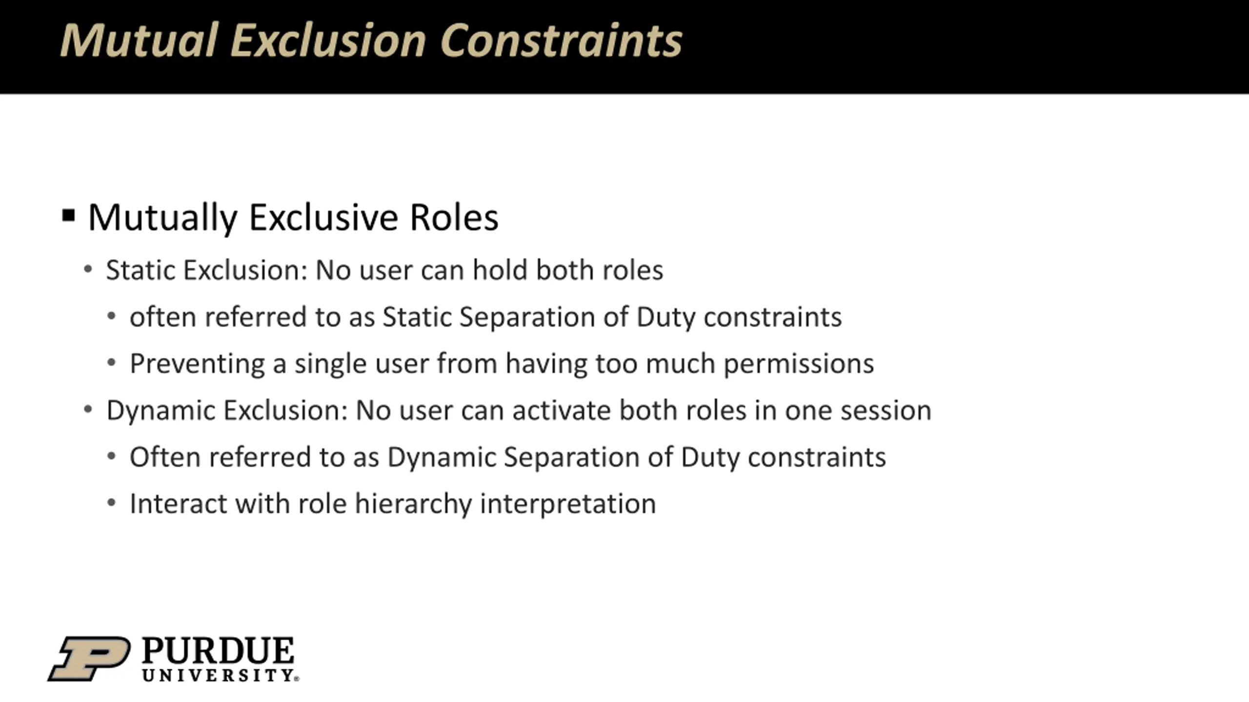 Mutual Exclusion Constraints Mutually Exclusive Roles Static Exclusion: No user can hold both roles often referred to as Static Separation of Duty constraints Preventing a single user from having too much permissions Dynamic Exclusion: No user can activate both roles in one session Often referred to as Dynamic Separation of Duty constraints Interact with role hierarchy interpretation