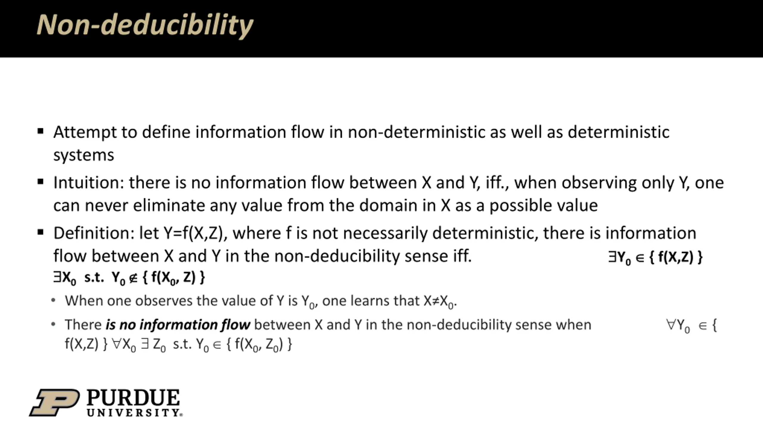 Non-deducibility Attempt to define information flow in non-deterministic as well as deterministic systems Intuition: there is no information flow between X and Y, iff., when observing only Y, one can never eliminate any value from the domain in X as a possible value Definition: let Y=f(X,Z), where f is not necessarily deterministic, there is information flow between X and Y in the non-deducibility sense iff. X0 s.t. Y0 { f(X0, Z) } When one observes the value of Y is Y0, one learns that X X0. There is no information flow between X and Y in the non-deducibility sense when f(X,Z) } X0 Z0 s.t. Y0 { f(X0, Z0) } Y0 { f(X,Z) } Y0 {