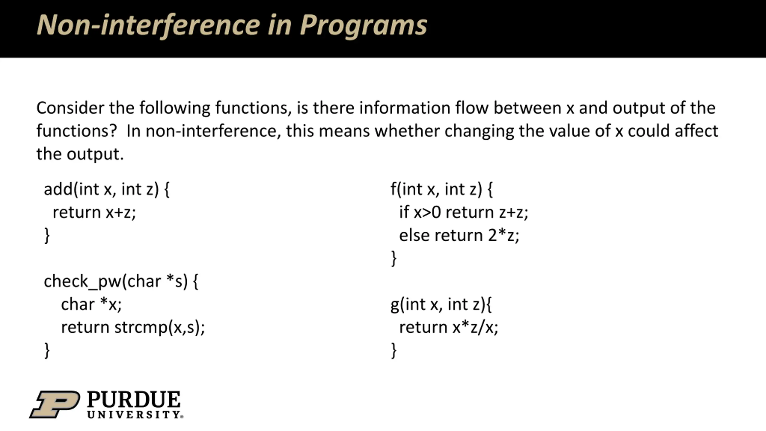 Non-interference in Programs Consider the following functions, is there information flow between x and output of the functions? In non-interference, this means whether changing the value of x could affect the output. add(int x, int z) { return x+z; } f(int x, int z) { if x>0 return z+z; else return 2*z; } check_pw(char *s) { char *x; return strcmp(x,s); } g(int x, int z){ return x*z/x; }