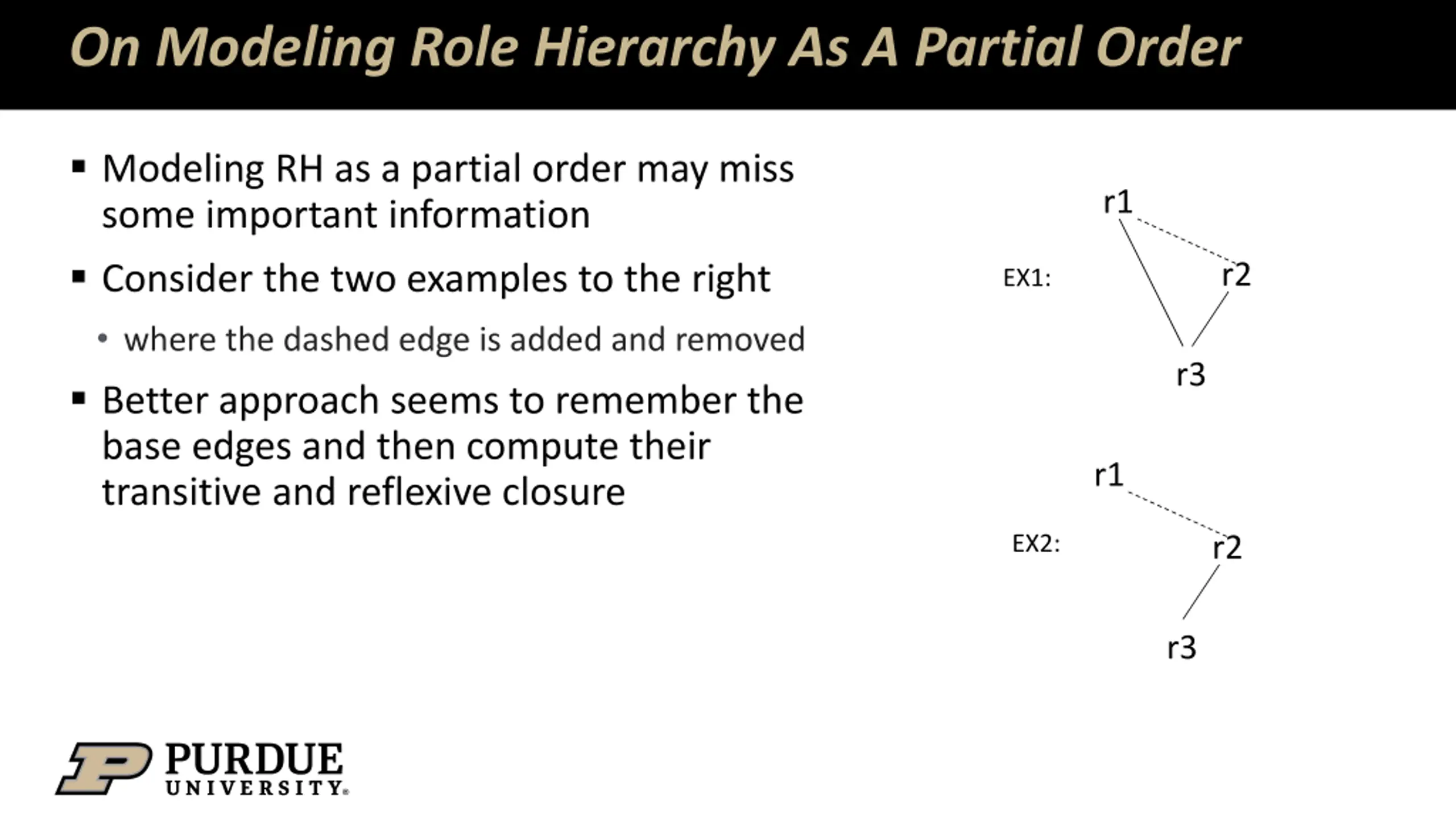 On Modeling Role Hierarchy As A Partial Order Modeling RH as a partial order may miss some important information Consider the two examples to the right where the dashed edge is added and removed Better approach seems to remember the base edges and then compute their transitive and reflexive closure r1 r2 EX1: r3 r1 EX2: r2 r3