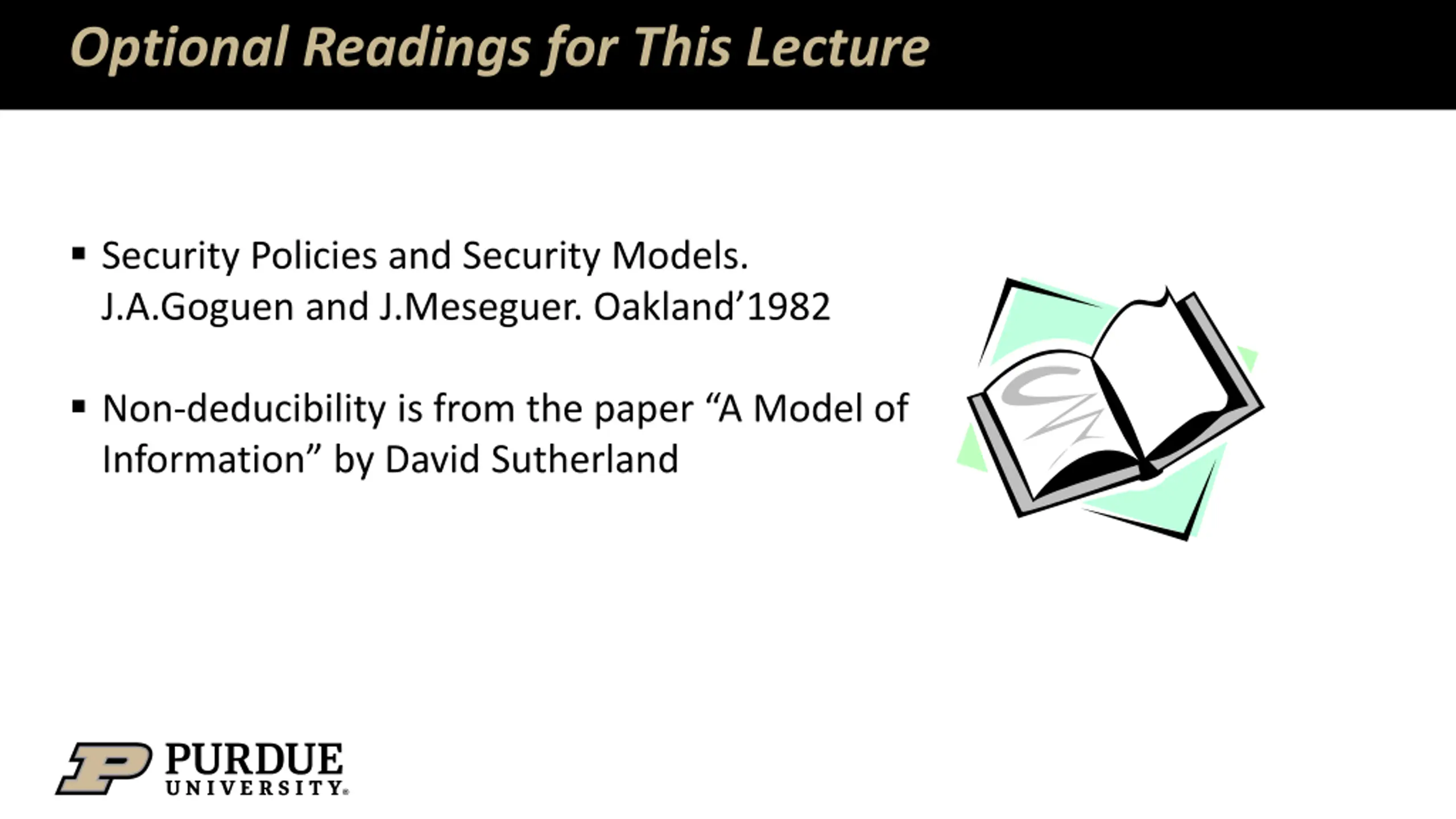 Optional Readings for This Lecture Security Policies and Security Models. J.A.Goguen and J.Meseguer. Oakland 1982 Non-deducibility is from the paper A Model of Information by David Sutherland