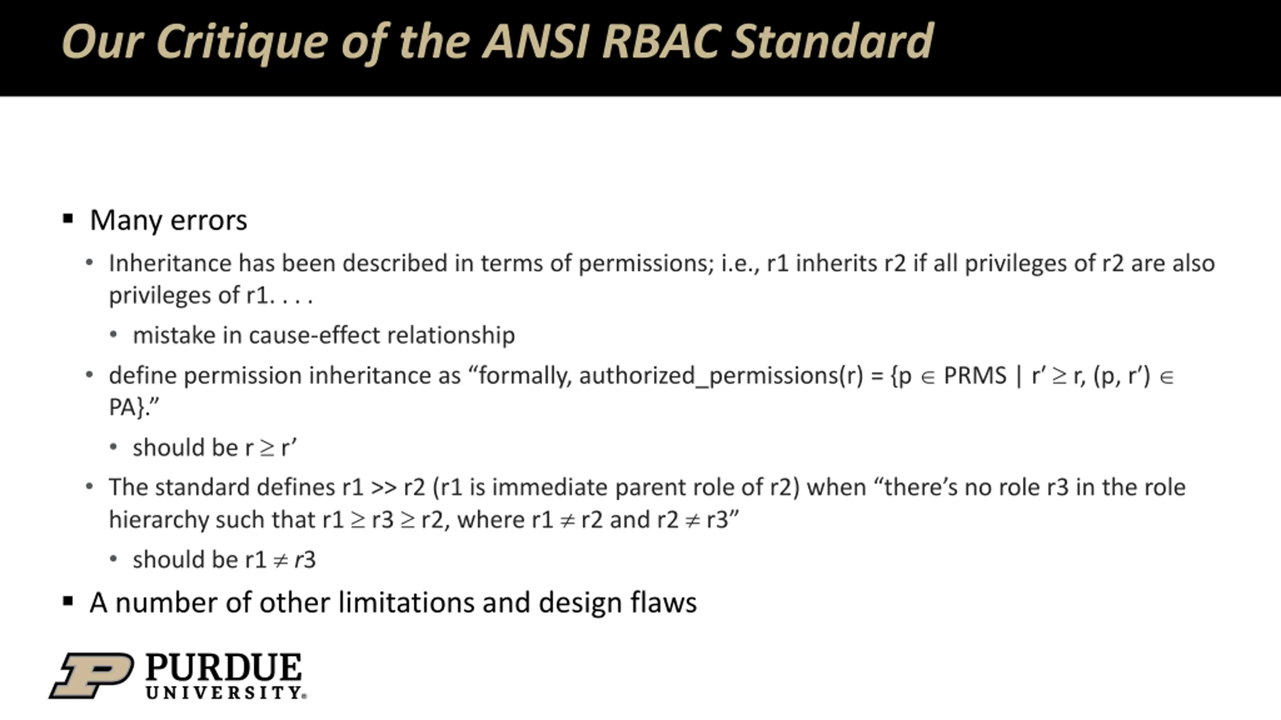 Our Critique of the ANSI RBAC Standard Many errors Inheritance has been described in terms of permissions; i.e., r1 inherits r2 if all privileges of r2 are also privileges of r1. . . . mistake in cause-effect relationship define permission inheritance as formally, authorized_permissions(r) = {p PRMS | r r, (p, r ) PA}. should be r r The standard defines r1 >> r2 (r1 is immediate parent role of r2) when there s no role r3 in the role hierarchy such that r1 r3 r2, where r1 r2 and r2 r3 should be r1 r3 A number of other limitations and design flaws
