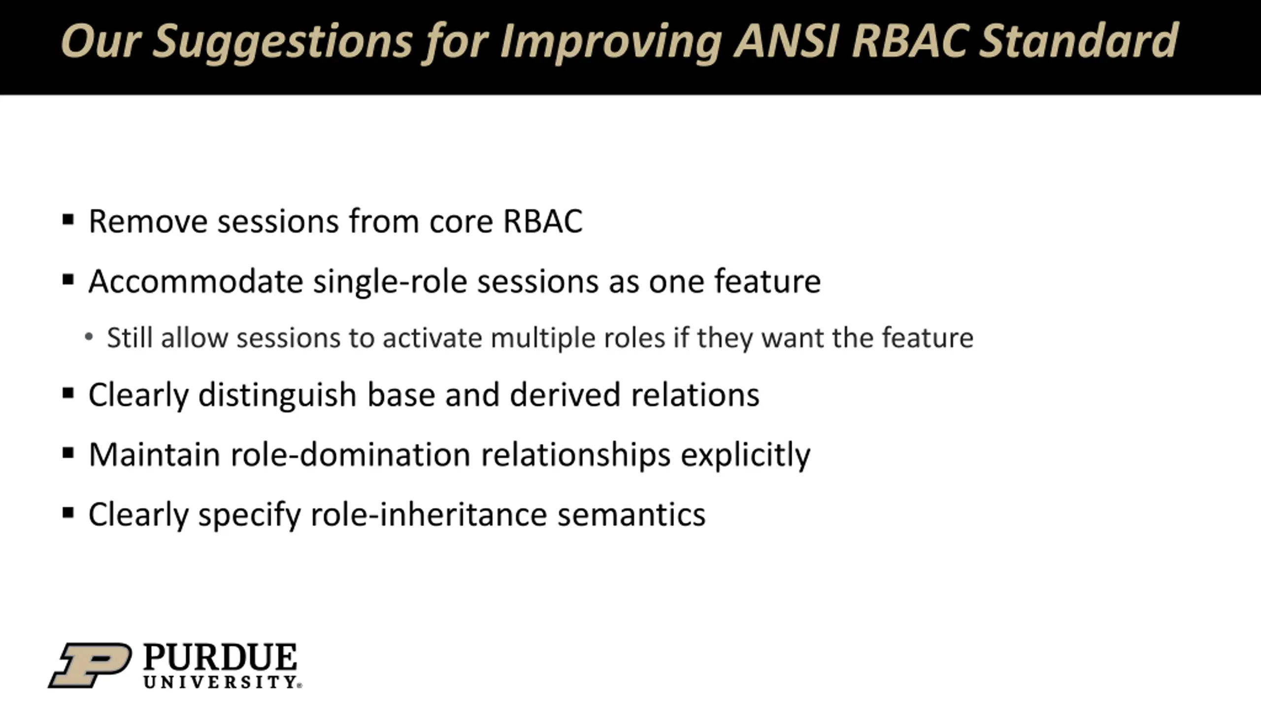 Our Suggestions for Improving ANSI RBAC Standard Remove sessions from core RBAC Accommodate single-role sessions as one feature Still allow sessions to activate multiple roles if they want the feature Clearly distinguish base and derived relations Maintain role-domination relationships explicitly Clearly specify role-inheritance semantics