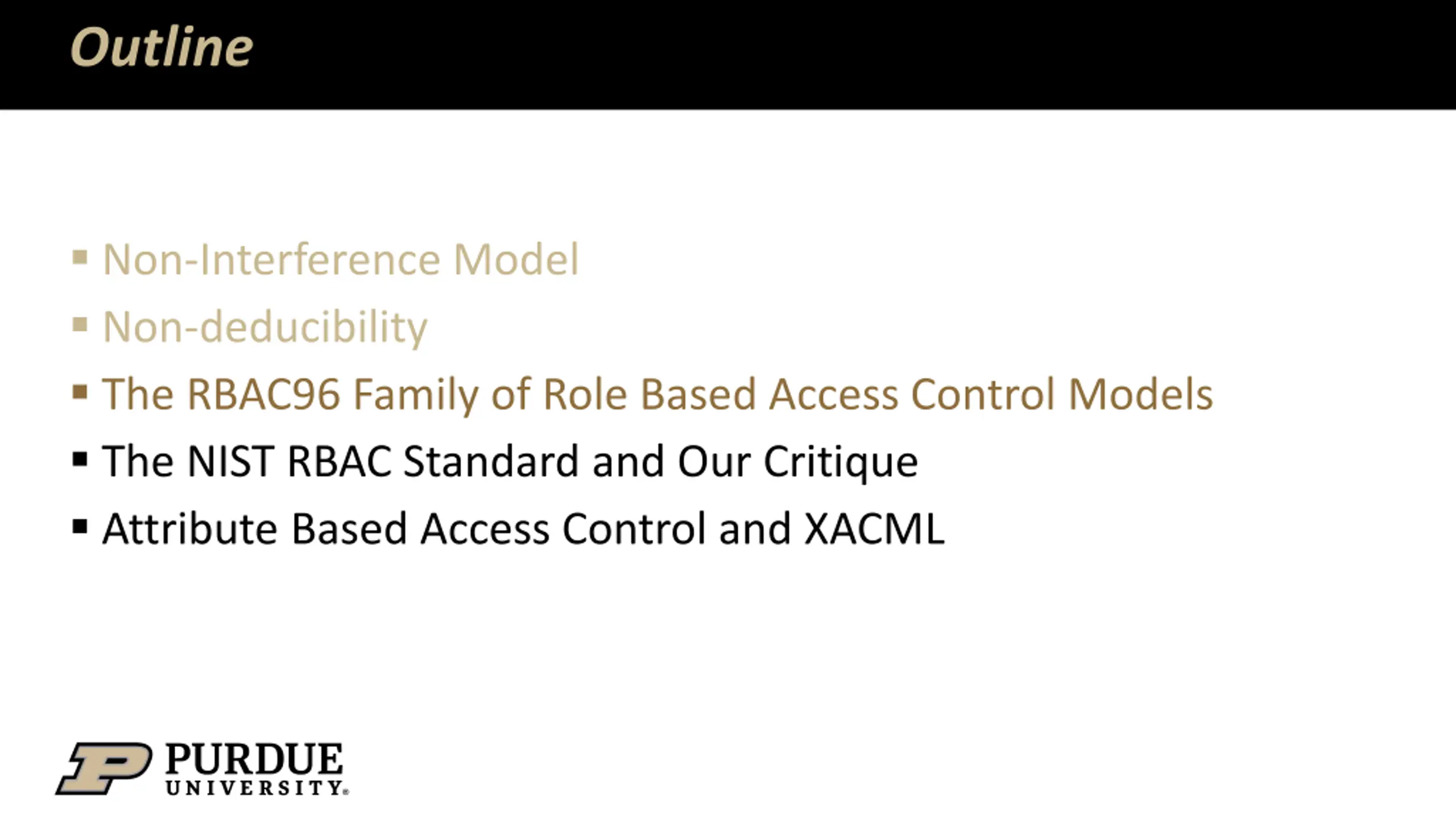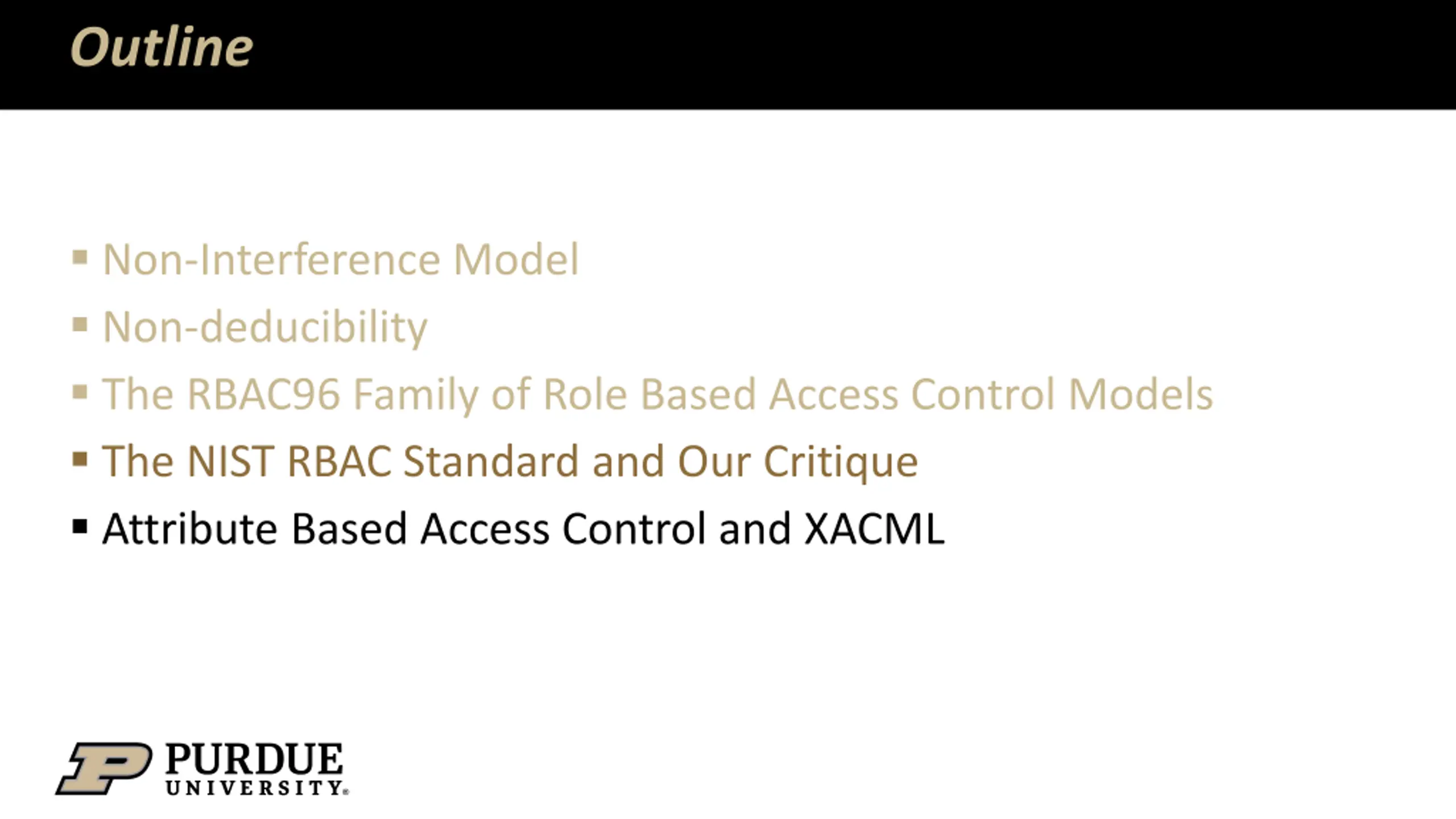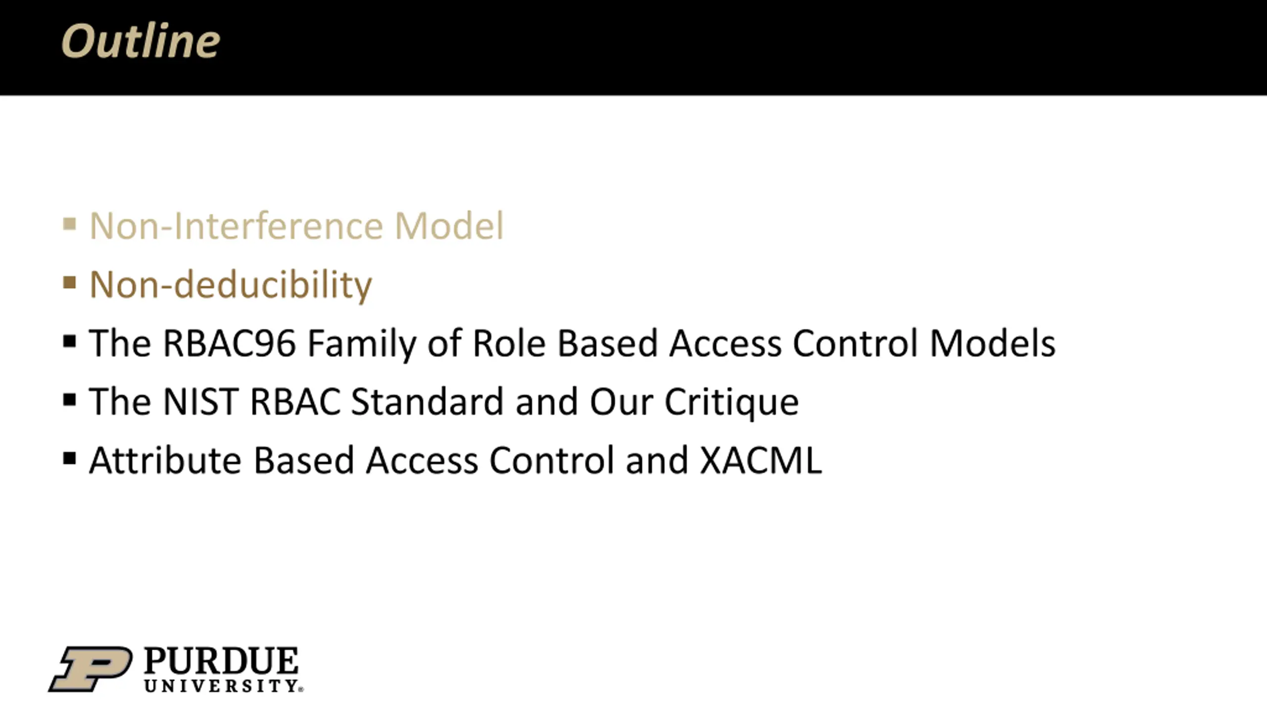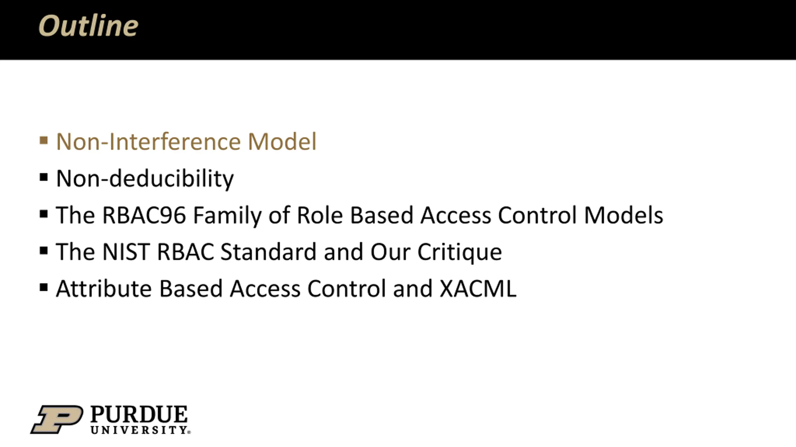 Outline Non-Interference Model Non-deducibility The RBAC96 Family of Role Based Access Control Models The NIST RBAC Standard and Our Critique Attribute Based Access Control and XACML