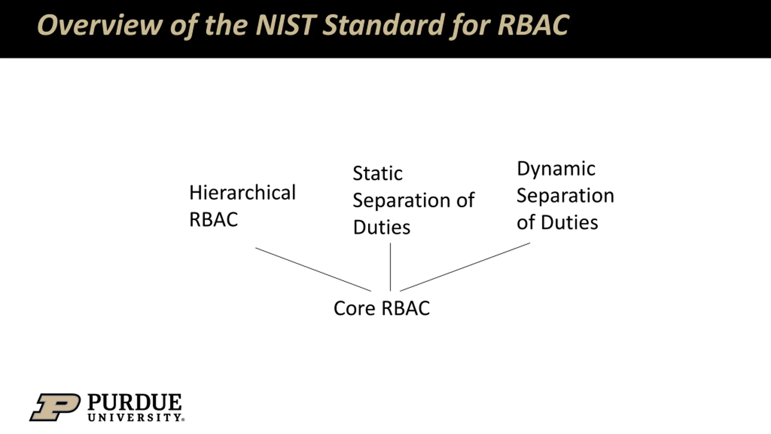 Overview of the NIST Standard for RBAC Dynamic Separation of Duties Static Separation of Duties Hierarchical RBAC Core RBAC