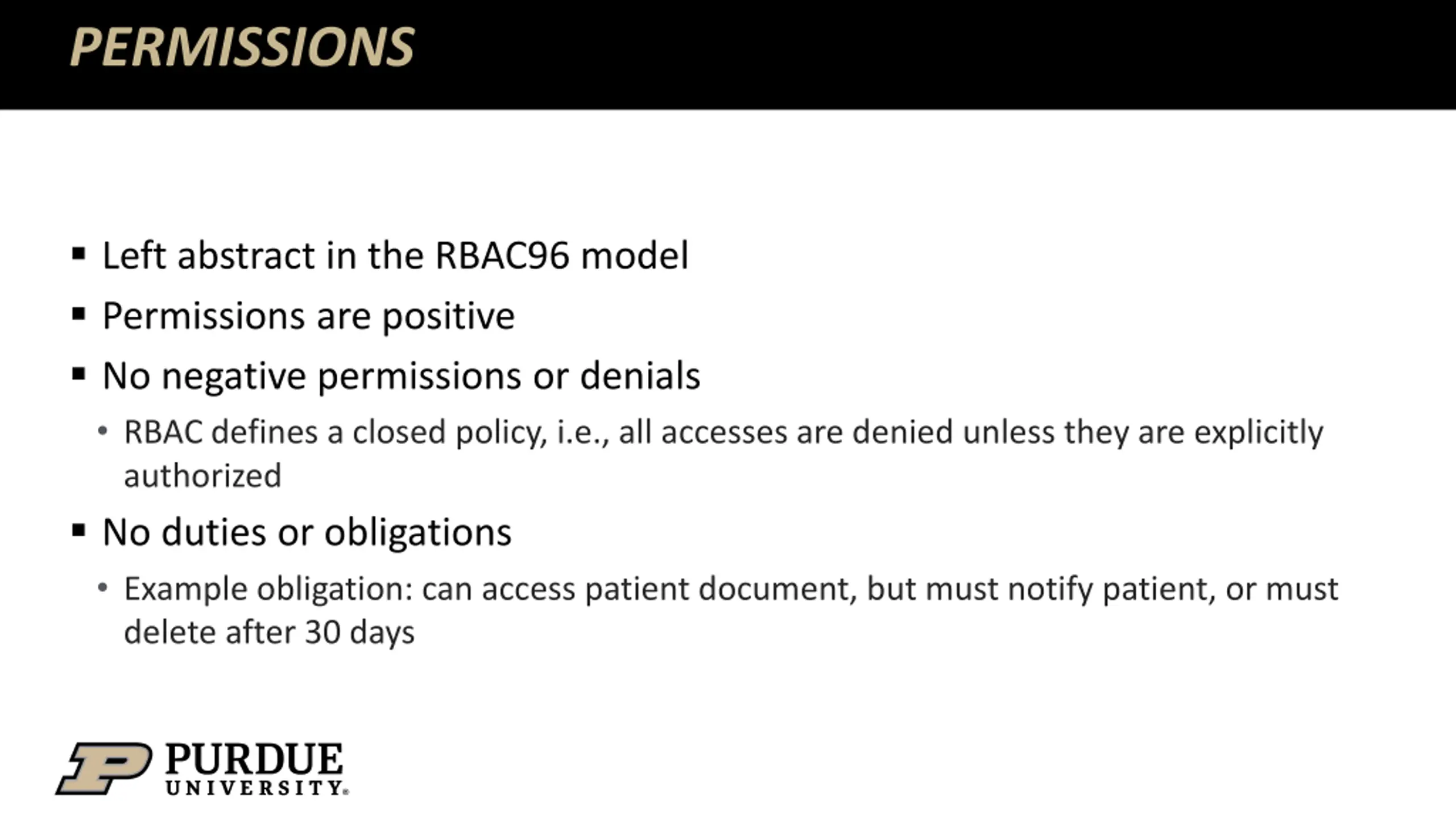 PERMISSIONS Left abstract in the RBAC96 model Permissions are positive No negative permissions or denials RBAC defines a closed policy, i.e., all accesses are denied unless they are explicitly authorized No duties or obligations Example obligation: can access patient document, but must notify patient, or must delete after 30 days