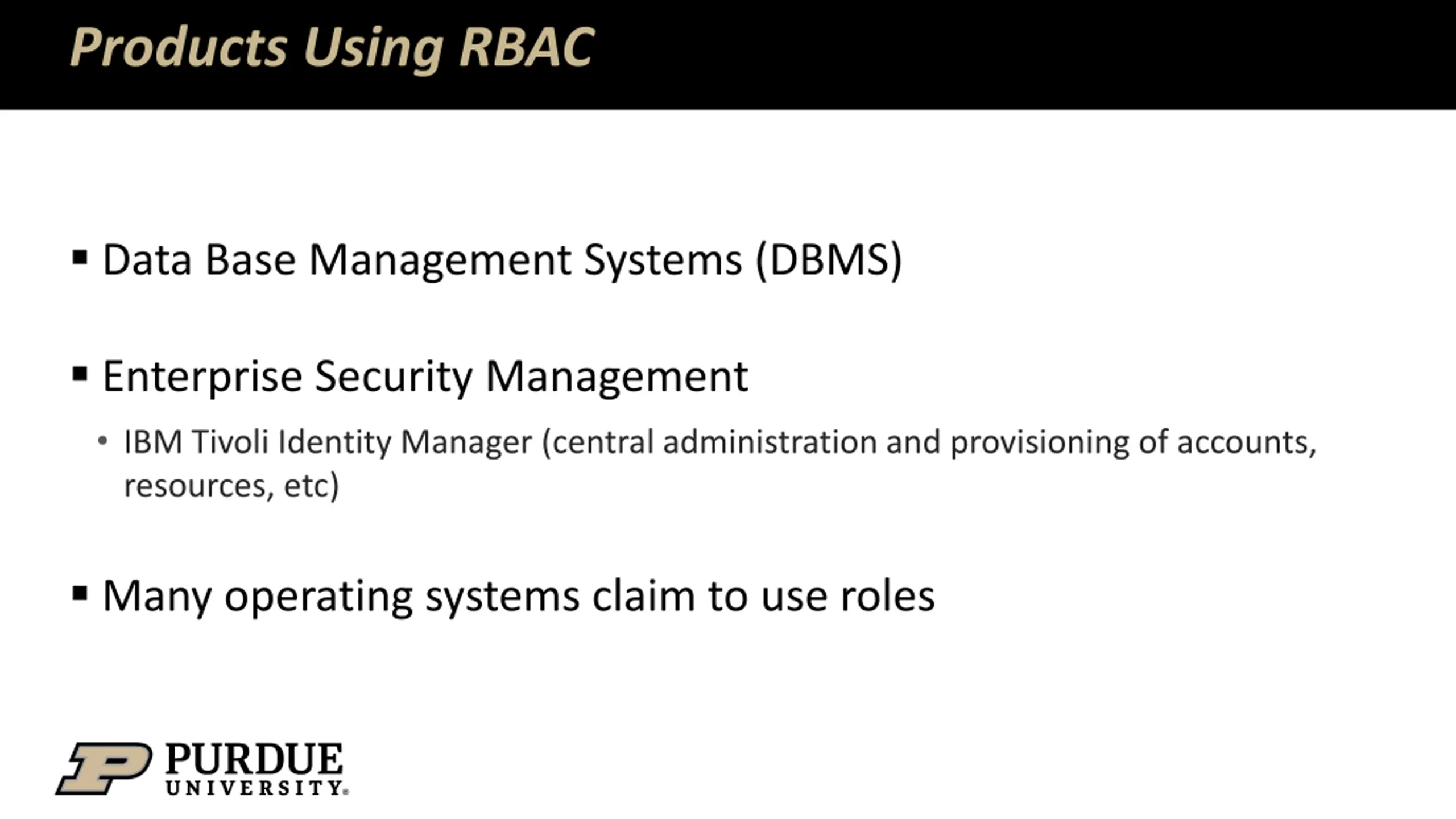 Products Using RBAC Data Base Management Systems (DBMS) Enterprise Security Management IBM Tivoli Identity Manager (central administration and provisioning of accounts, resources, etc) Many operating systems claim to use roles